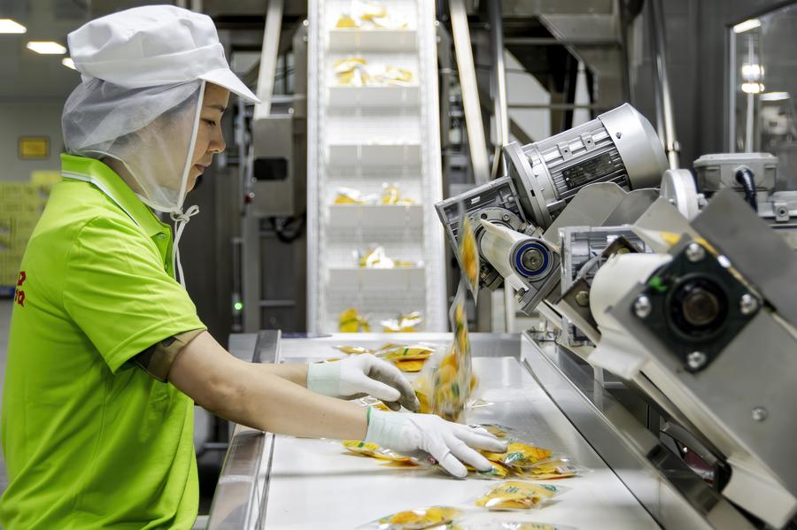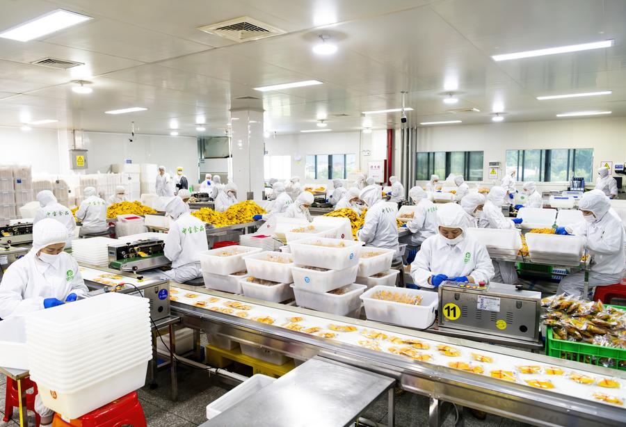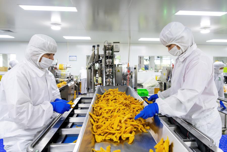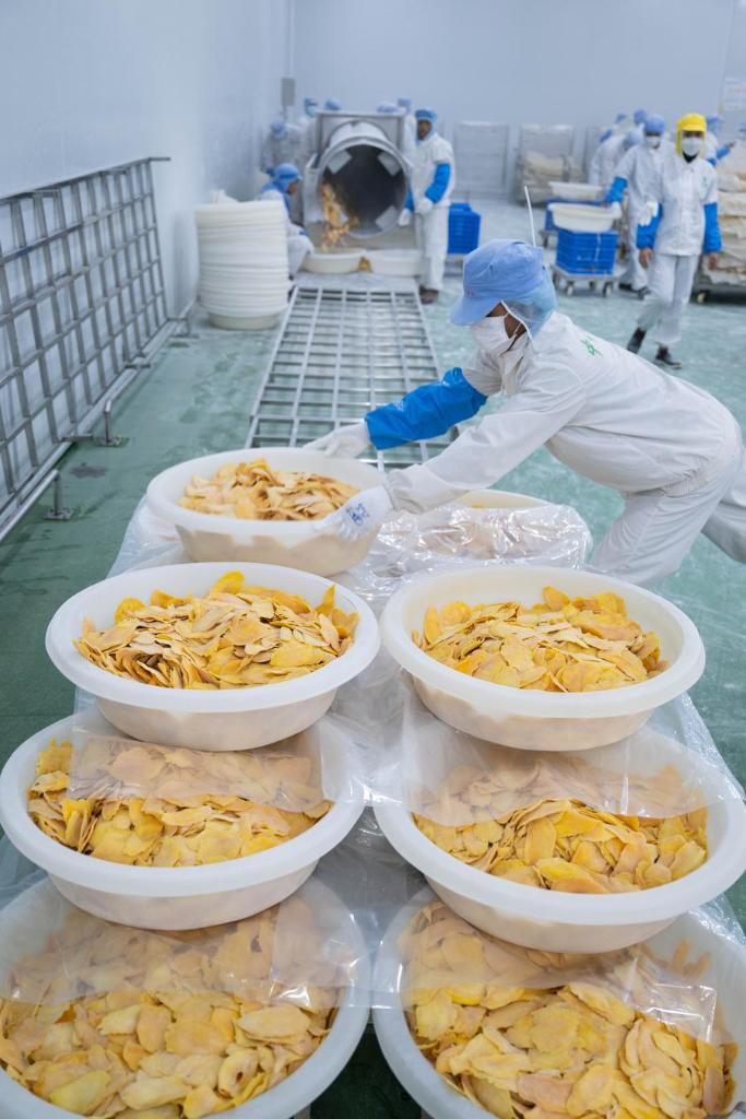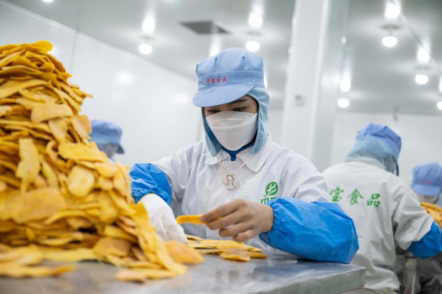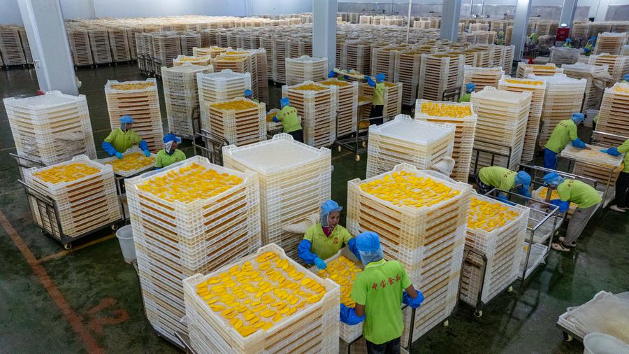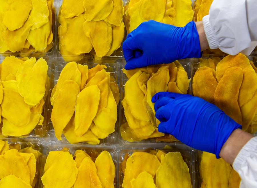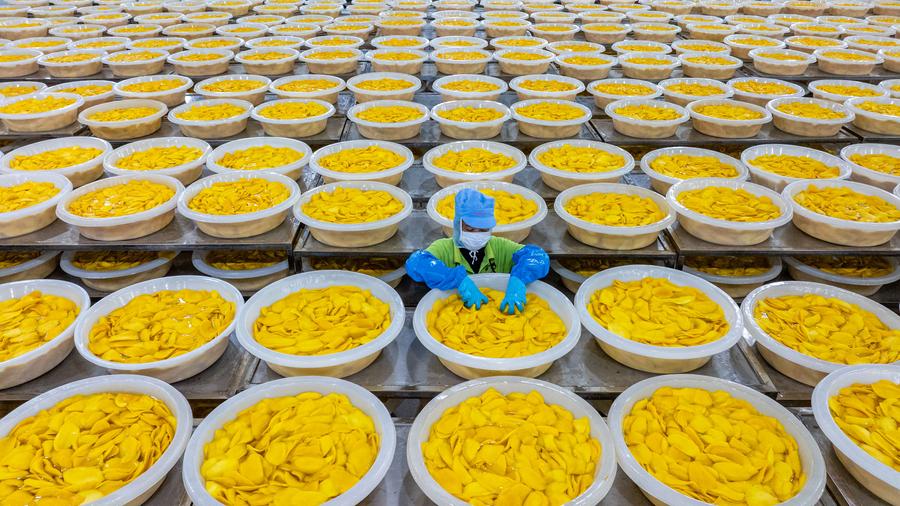 At the mango processing factory, invested and constructed by China's Zhong Bao (Fujian) Food Science & Technology Co. Ltd., in western Cambodia's Phnom Sruoch district, ripe mangoes undergo processes such as washing, peeling, slicing, sugar curing, and drying, finally transforming into sweet and chewy dried mango slices. These dried mangoes are then transported via sea shipping to Zhong Bao (Fujian) Food Science & Technology Co. Ltd. in southeast China's Fujian Province. After undergoing sorting, packaging, and packing, they can reach the shelves of Chinese supermarkets within days.