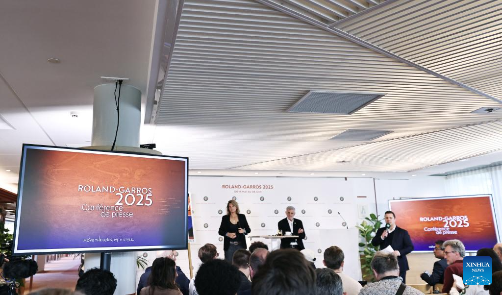Roland-Garros Open tennis tournament's director Amelie Mauresmo (L) and President of the French Tennis Federation Gilles Moretton (C) attend a press conference presenting the 2025 edition of the Roland Garros Grand Slam tennis tournament at the Roland Garros stadium, western Paris, France, April 17, 2025. (Xinhua/Gao Jing)