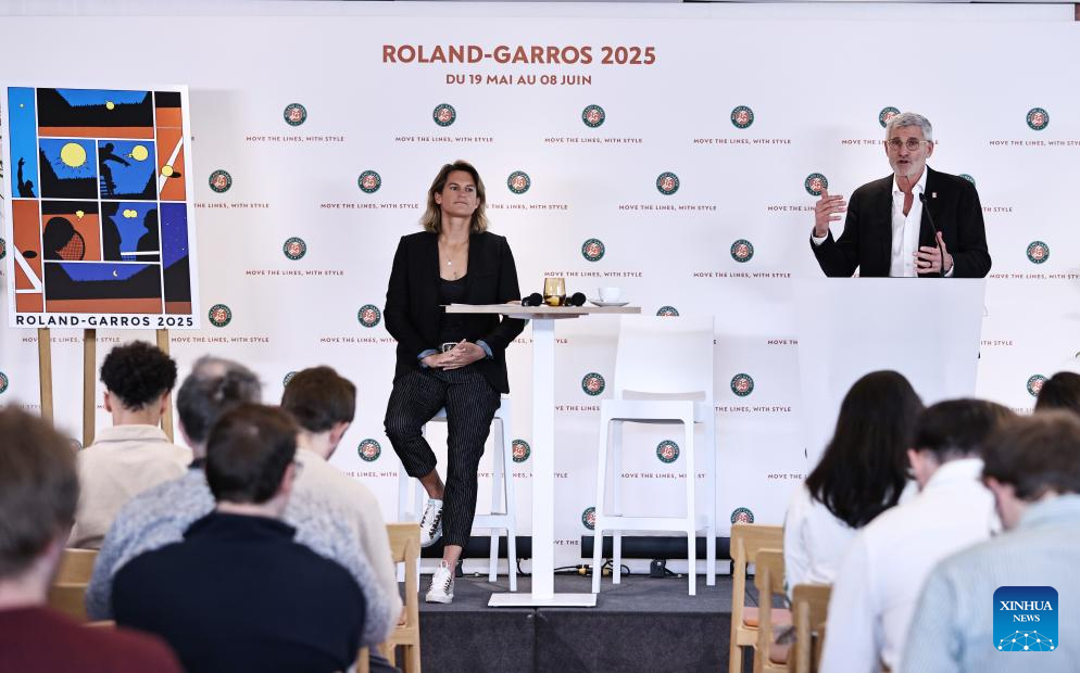 Roland-Garros Open tennis tournament's director Amelie Mauresmo (L) and President of the French Tennis Federation Gilles Moretton attend a press conference presenting the 2025 edition of the Roland Garros Grand Slam tennis tournament at the Roland Garros stadium, western Paris, France, April 17, 2025. (Xinhua/Gao Jing)