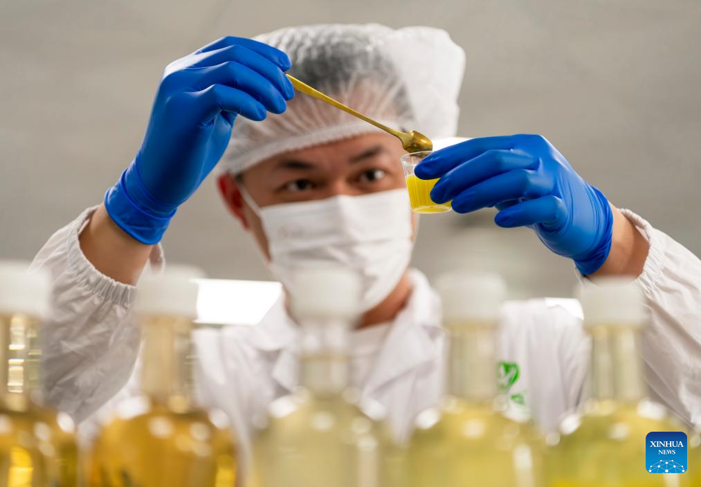 A staff member checks the quality of mango drinks at the technology center of Zhong Bao (Fujian) Food Science & Technology Co. Ltd. in Pinghe County of Zhangzhou City, southeast China's Fujian Province, March 26, 2025. In western Cambodia's Phnom Sruoch district, the abundant sunshine, plentiful rainfall, and fertile soil provide ideal natural conditions for mango cultivation, yielding mangoes featuring tender flesh and rich aroma.
