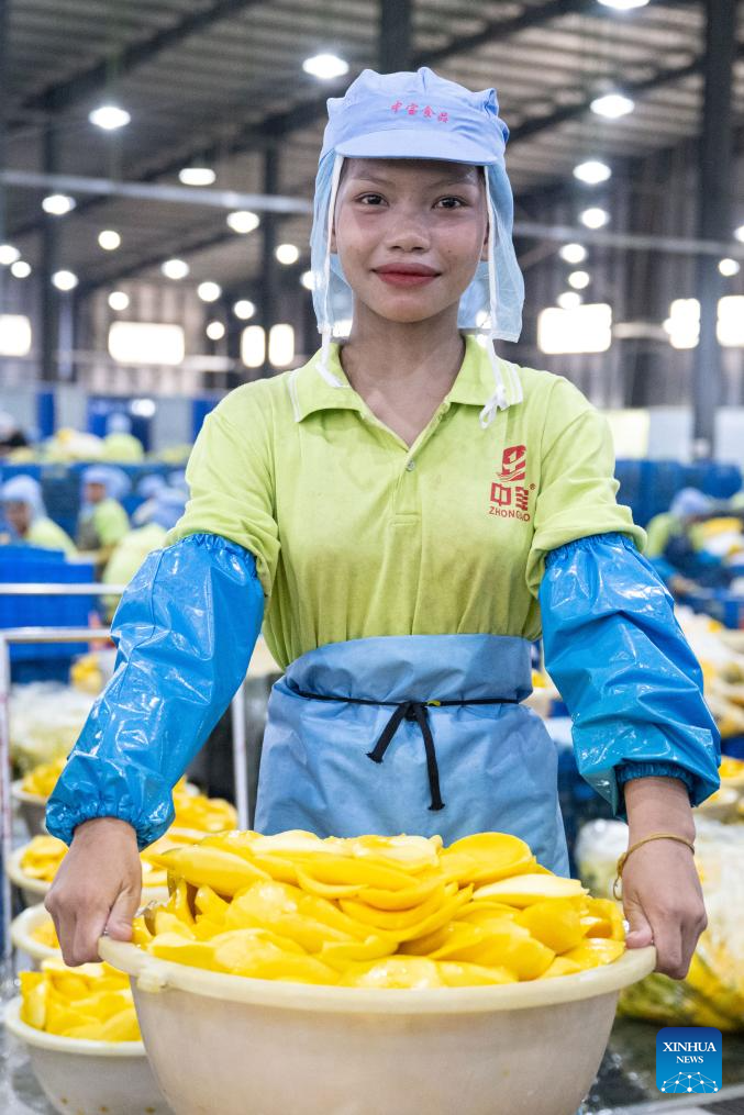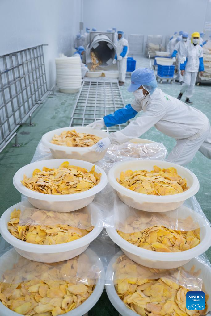Workers are seen busy on the food processing line of Zhong Bao (Fujian) Food Science & Technology Co. Ltd. in Pinghe County of Zhangzhou City, southeast China's Fujian Province, March 26, 2025. In western Cambodia's Phnom Sruoch district, the abundant sunshine, plentiful rainfall, and fertile soil provide ideal natural conditions for mango cultivation, yielding mangoes featuring tender flesh and rich aroma.