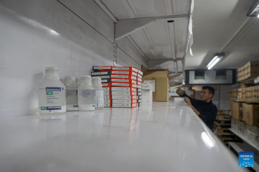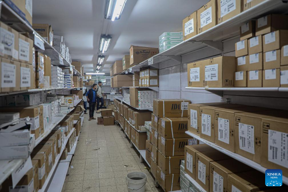 This photo taken on April 17, 2025 shows a warehouse of Gaza-based health authorities in Gaza City, on April 17, 2025. Israel's recently-outlined policy of blocking humanitarian aid to the Gaza Strip attempts to "militarize" humanitarian aid and displace Palestinians, a Palestinian official said Wednesday. (Photo by Rizek Abdeljawad/Xinhua)