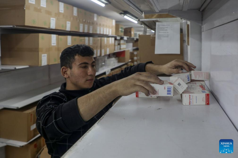 A worker sorts medications at a warehouse of Gaza-based health authorities in Gaza City, on April 17, 2025. Israel's recently-outlined policy of blocking humanitarian aid to the Gaza Strip attempts to "militarize" humanitarian aid and displace Palestinians, a Palestinian official said Wednesday. (Photo by Rizek Abdeljawad/Xinhua)