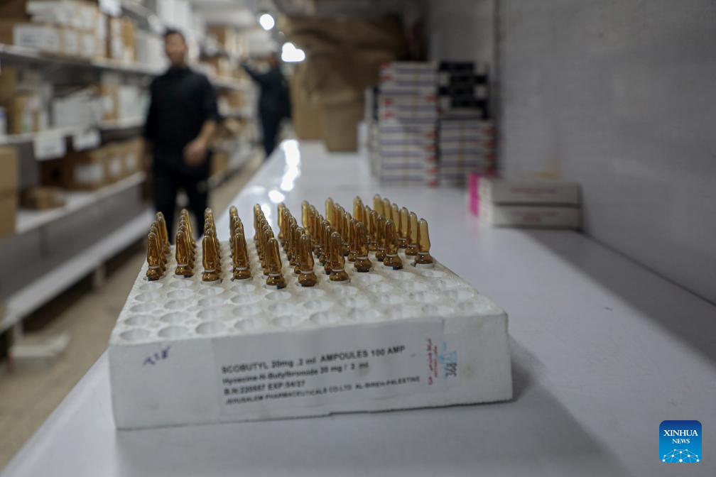 This photo taken on April 17, 2025 shows medications at a warehouse of Gaza-based health authorities in Gaza City, on April 17, 2025. Israel's recently-outlined policy of blocking humanitarian aid to the Gaza Strip attempts to "militarize" humanitarian aid and displace Palestinians, a Palestinian official said Wednesday. (Photo by Rizek Abdeljawad/Xinhua)