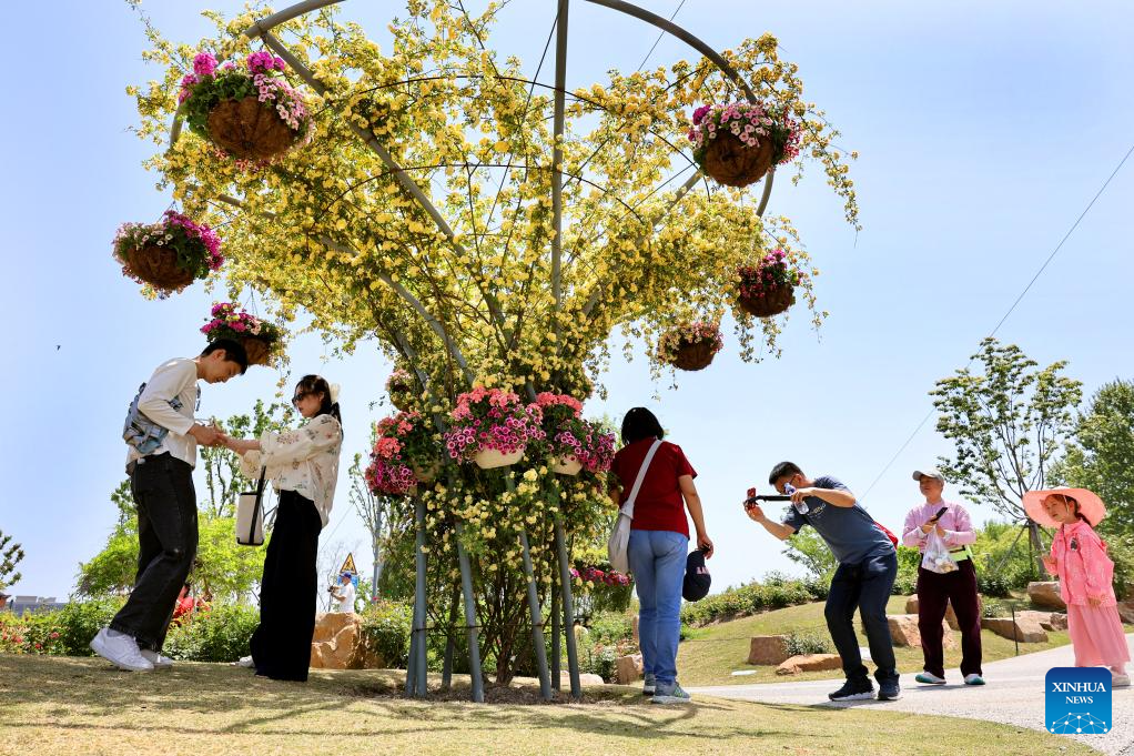 People enjoy themselves at a venue of the 2025 Shanghai International Flower Show in Huangpu District of east China's Shanghai, April 18, 2025. The 2025 Shanghai International Flower Show opened on Friday with two main venues, five sub-venues and 15 exhibition spots across the city. (Xinhua/Wang Xiang)