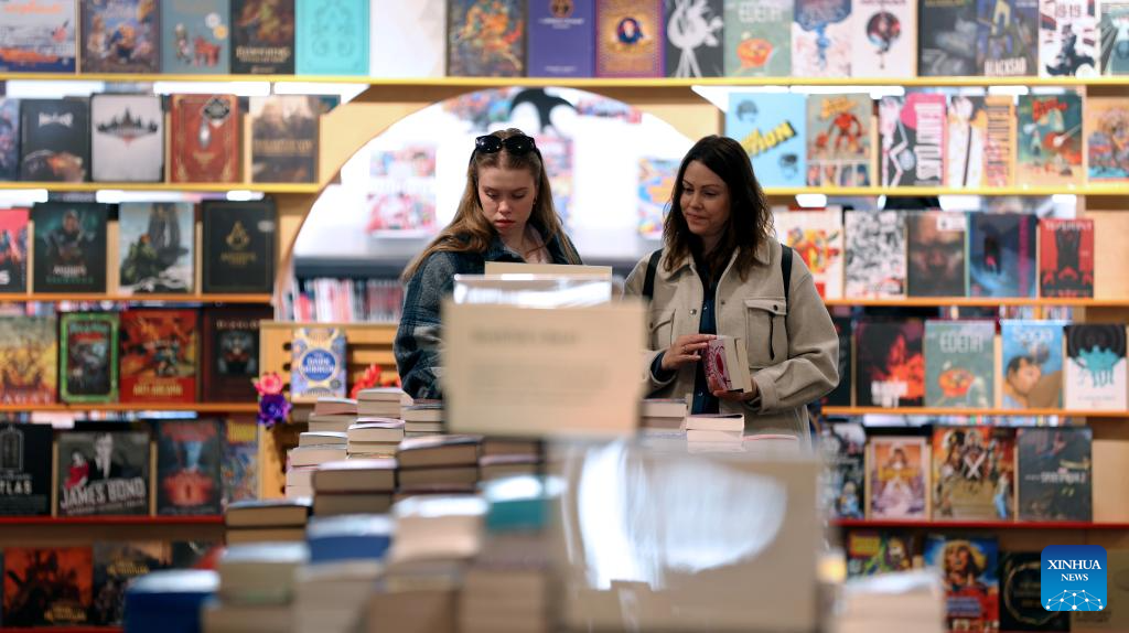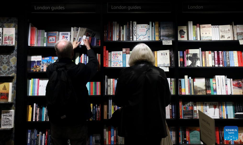 People visit Waterstones' flagship Piccadilly bookshop in London, Britain, April 17, 2025. Britain's largest book chain, Waterstones, attracts a large number of readers to experience the charm of paper books. (Xinhua/Li Ying)