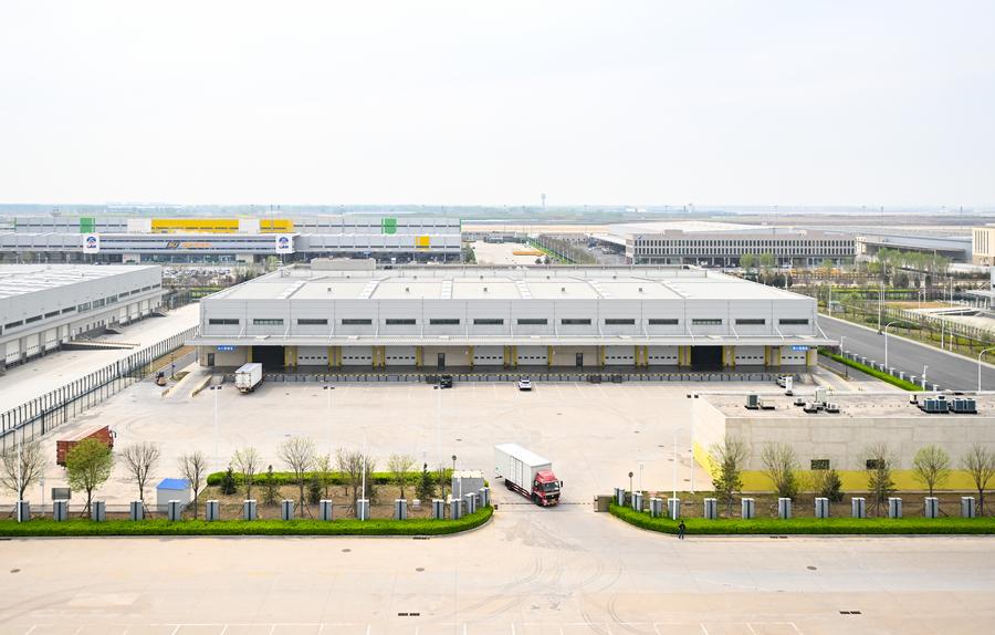 BEIJING, April 18 (Xinhua) -- A truck loaded with 1.3 tonnes of clothing, hats, sunglasses and other goods departed from the cross-border e-commerce warehouse at the comprehensive bonded zone of Beijing Daxing International Airport (BDIA), heading to the international cargo terminal of China Southern Air Logistics Co., Ltd. at the airport.