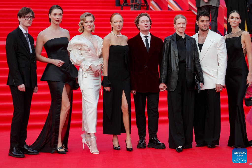 Guests pose for photos as they arrive to attend the opening ceremony of the 47th Moscow International Film Festival in Moscow, Russia, on April 17, 2025. The 47th Moscow International Film Festival opened Thursday in the Russian capital, with a dedicated BRICS film program featured among its lineup. (Photo by Alexander Zemlianichenko Jr/Xinhua)