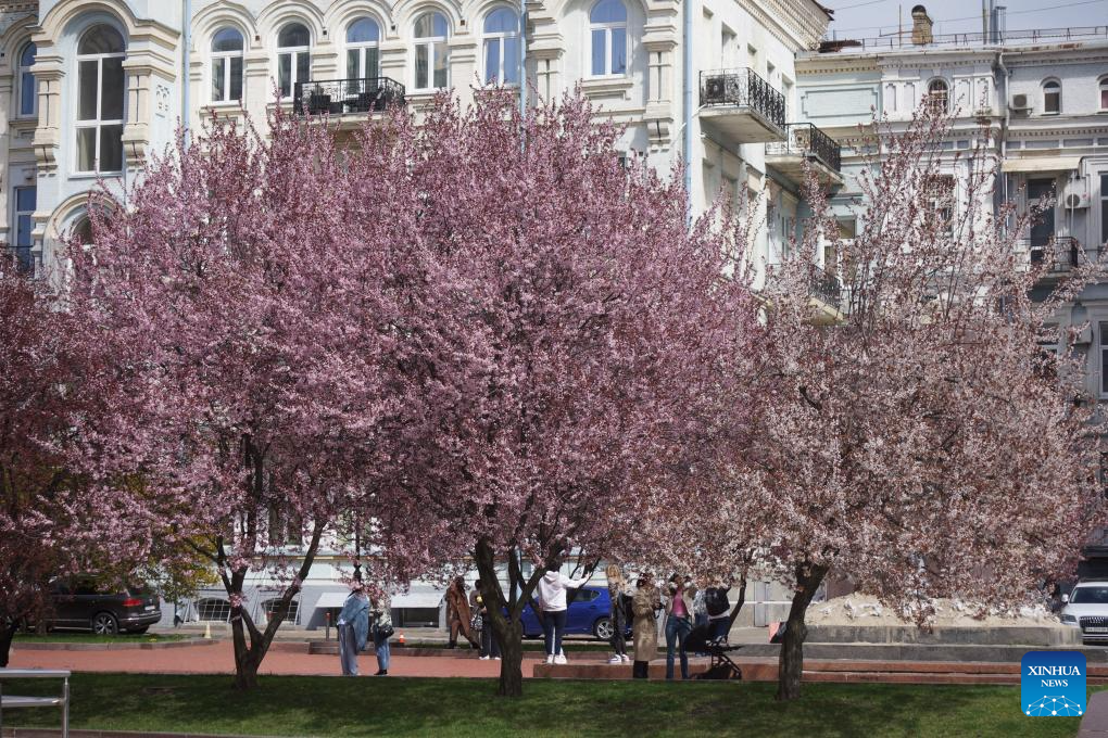 People walk under cherry blossoms in Kiev, Ukraine, April 17, 2025. (Photo by Roman Petushkov/Xinhua)