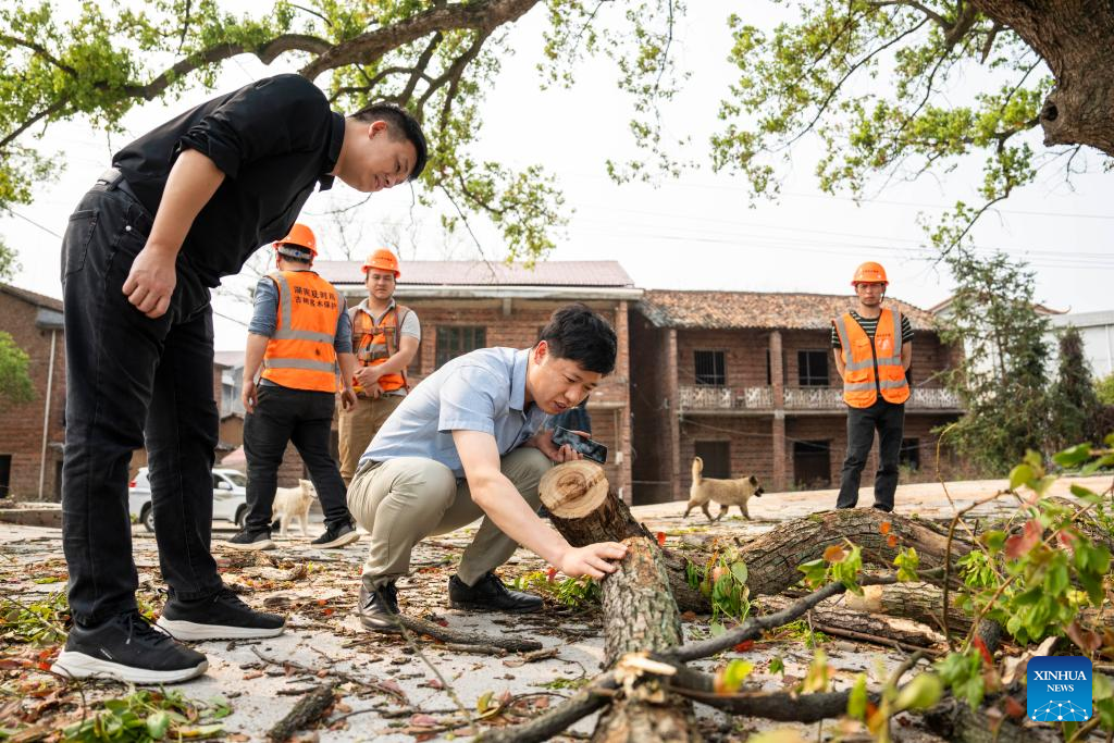 Wu Lei (2nd R), a specialist in ancient tree conservation, diagnoses the condition of an ancient tree based on dead branches in Xinyuan Village of Hengshan County, Hengyang City, central China's Hunan Province, March 27, 2025.(Xinhua/Chen Sihan)