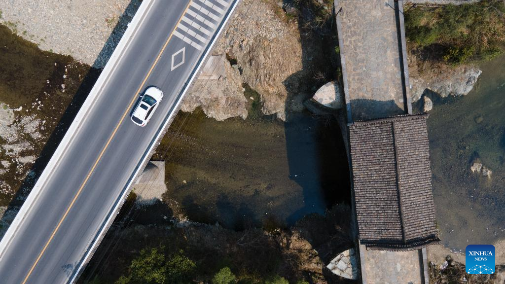 An aerial drone photo taken on March 24, 2025 shows the Shuizhukeng roofed bridge in Shexian County of Huangshan City, east China's Anhui Province. Roofed bridge, also called covered bridge, is a unique architectural structure in Huangshan City. These ingeniously structured and elegantly shaped bridges carry rich cultural significance and form a distinctive part of Huizhou culture.