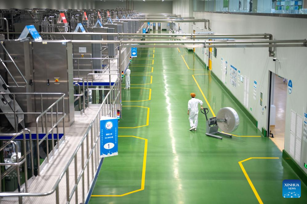 Staff members work in the filling workshop of the Global Intelligent Manufacturing Industrial Park of Yili Modern Intelligent Health Valley in Tumd Left Banner in Hohhot, north China's Inner Mongolia Autonomous Region, April 17, 2025. In recent years, Inner Mongolia Autonomous Region has given full play to its resource endowment and industrial advantages, and promoted the upgrading of the whole chain of dairy industry with scientific and technological innovation, advancing the quality development of dairy industry. (Photo by Li Xinyi/Xinhua)