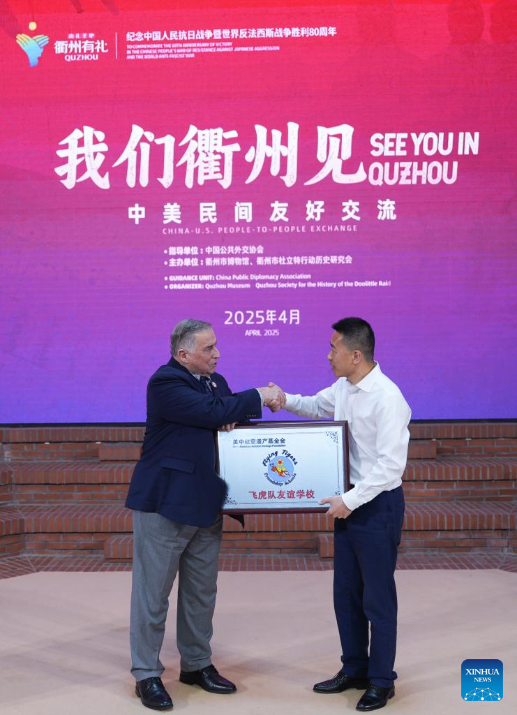 Chairman of the Sino-American Aviation Heritage Foundation Jeffrey Ballard (L) and a representative of Zhejiang Quzhou High School shake hands during a ceremony of establishing a partnership with the school in Quzhou City, east China's Zhejiang Province, April 18, 2025. The school becomes a participant of the program of the Flying Tigers Friendship School, which aims to enhance mutual understanding and friendship between young people in the two countries. A China-U.S. people-to-people exchange activity was held Thursday and Friday in Quzhou City, east China's Zhejiang Province, to commemorate the 83rd anniversary of the Doolittle Raid.