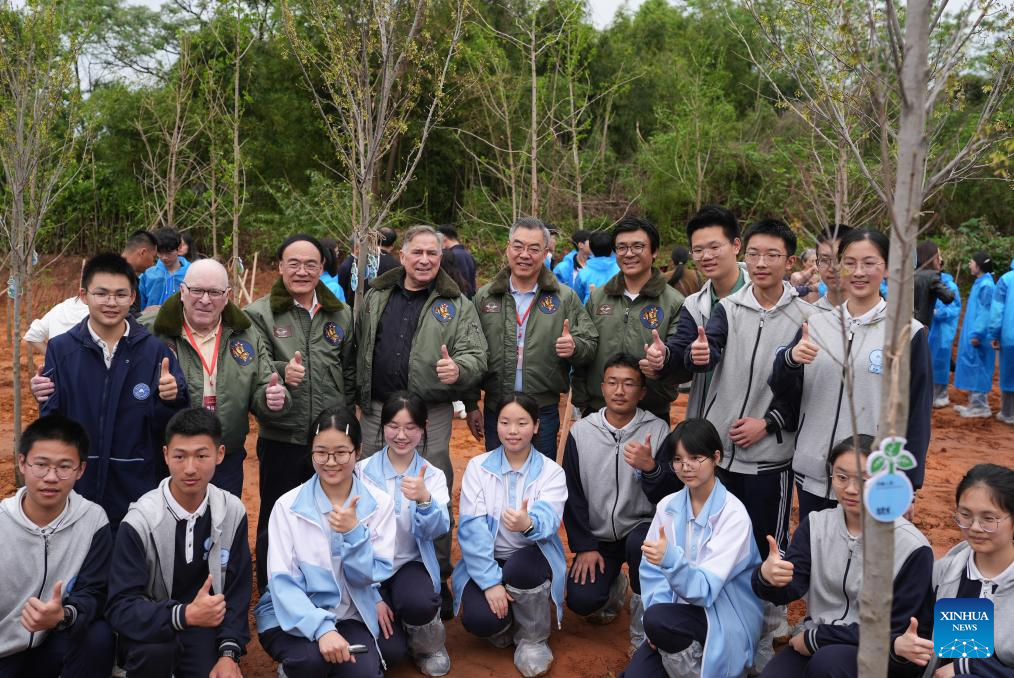Guests and students pose for a group photo after planting trees in Quzhou City, east China's Zhejiang Province, April 17, 2025. A China-U.S. people-to-people exchange activity was held Thursday and Friday in Quzhou City, east China's Zhejiang Province, to commemorate the 83rd anniversary of the Doolittle Raid.