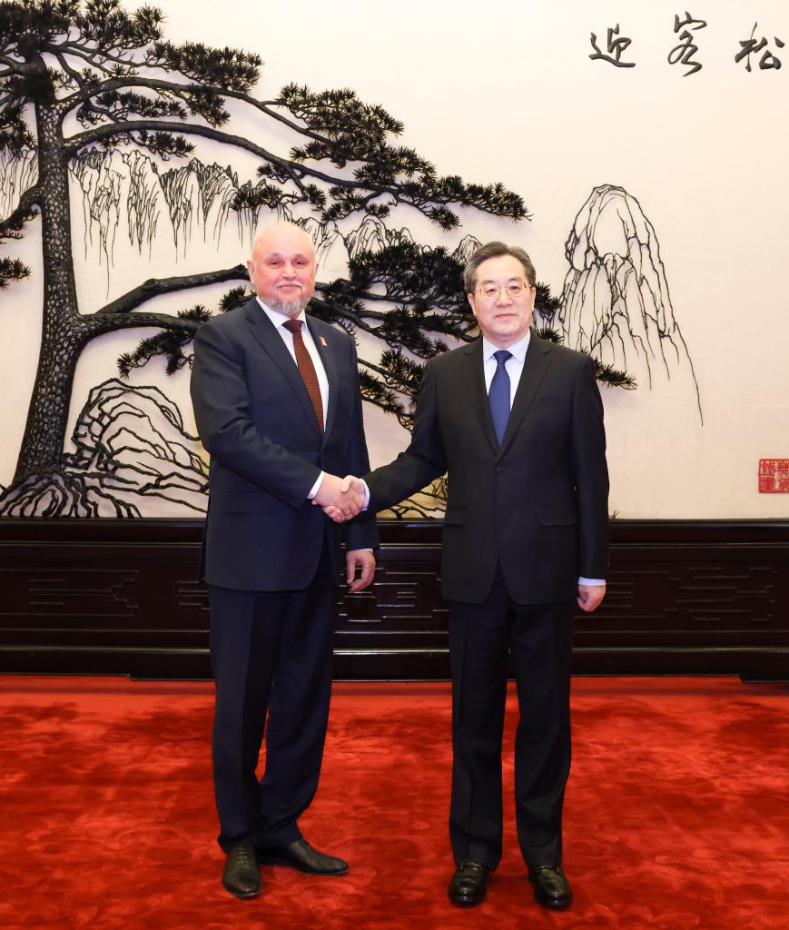 Chinese Vice Premier Ding Xuexiang, also a member of the Standing Committee of the Political Bureau of the Communist Party of China Central Committee, meets with Russian Minister of Energy Sergei Tsivilev in Beijing, capital of China, April 18, 2025. (Xinhua/Pang Xinglei)