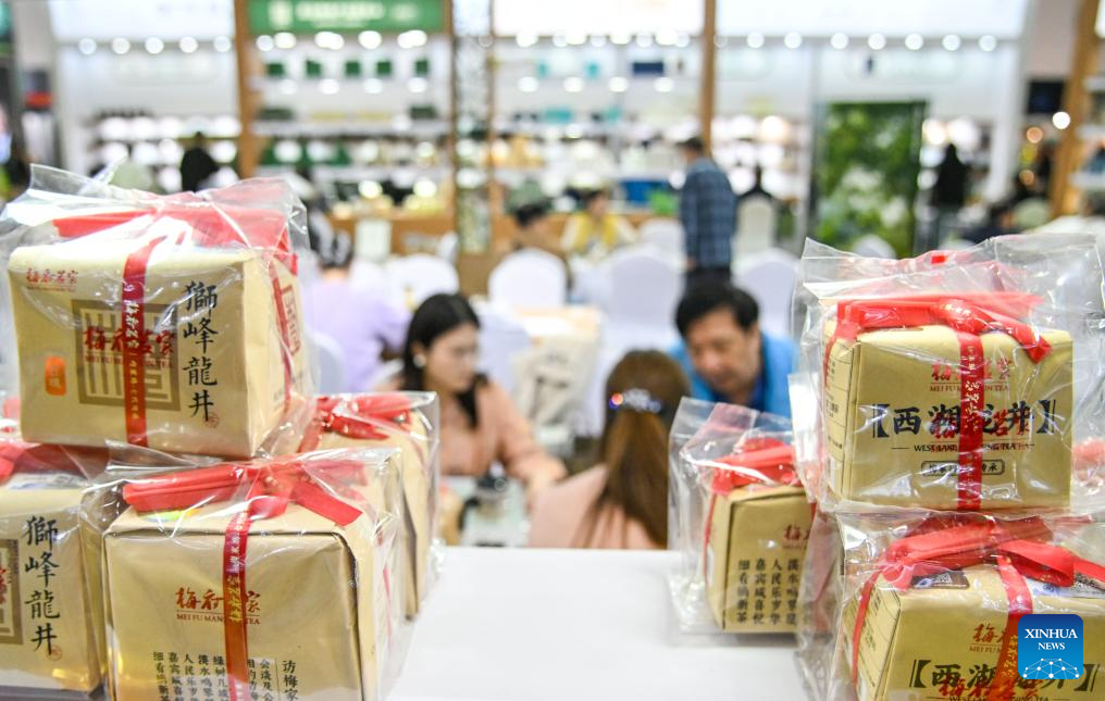 This photo taken on April 18, 2025 shows tea products exhibited during the 18th Beijing International Tea and Tea Ceremony Exhibition at the China Agricultural Exhibition Center in Beijing, capital of China. The four-day Beijing International Tea and Tea Ceremony Exhibition kicked off in Beijing on Friday, attracting exhibitors from more than 700 tea-related enterprises. (Xinhua/Chen Yehua)