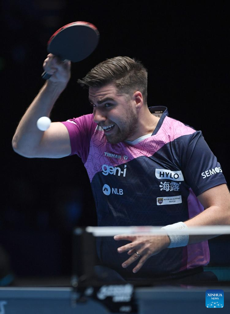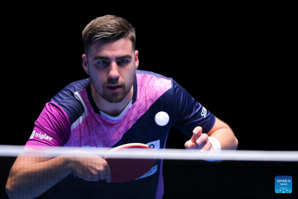 Darko Jorgic of Slovenia hits a return during the men's singles quarterfinal match between Liang Jingkun of China and Darko Jorgic of Slovenia at the ITTF Men's and Women's World Cup 2025 in Macao, China, April 18, 2025. (Xinhua/Cheong Kam Ka)