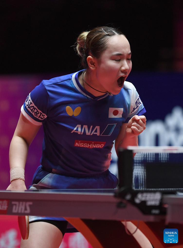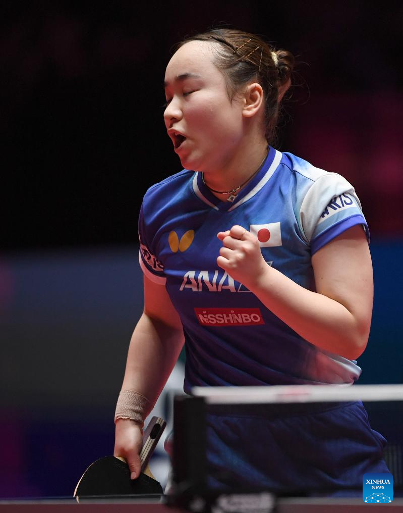 Ito Mima celebrates scoring during the women's singles quarterfinal match between Ito Mima of Japan and Odo Satsuki of Japan at the ITTF Men's and Women's World Cup 2025 in Macao, China, April 18, 2025. (Xinhua/Chen Duo)