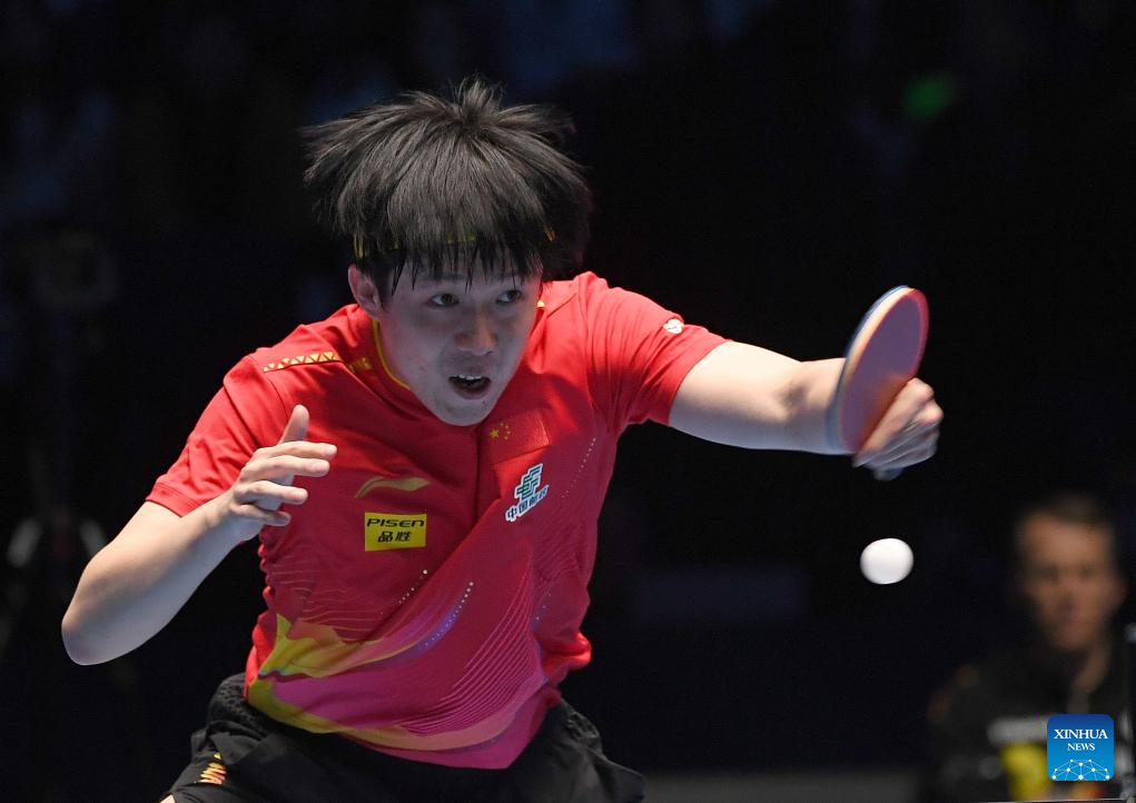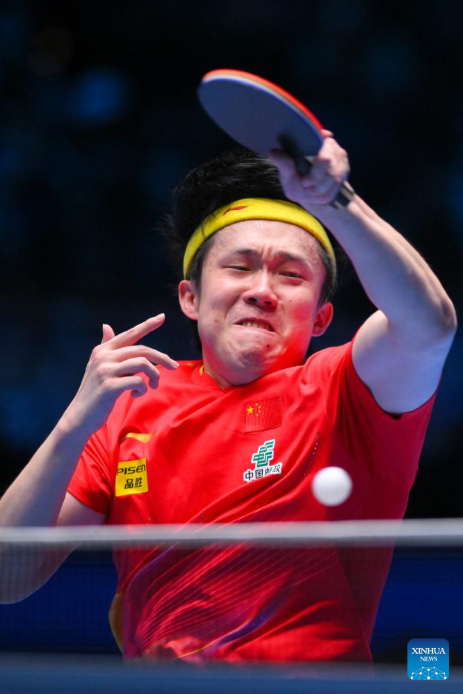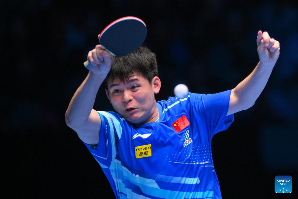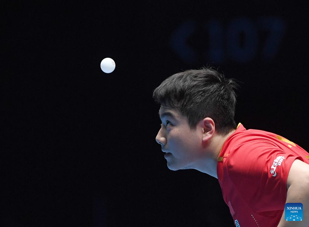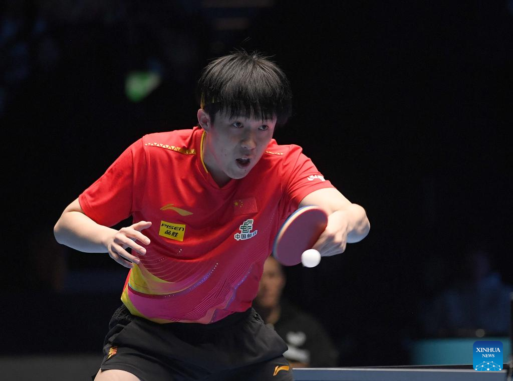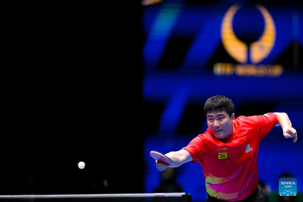 Wang Chuqin of China hits a return during the men's singles quarterfinal match between Wang Chuqin of China and Benedikt Duda of Germany at the ITTF Men's and Women's World Cup 2025 in Macao, China, April 18, 2025. (Xinhua/Chen Duo)