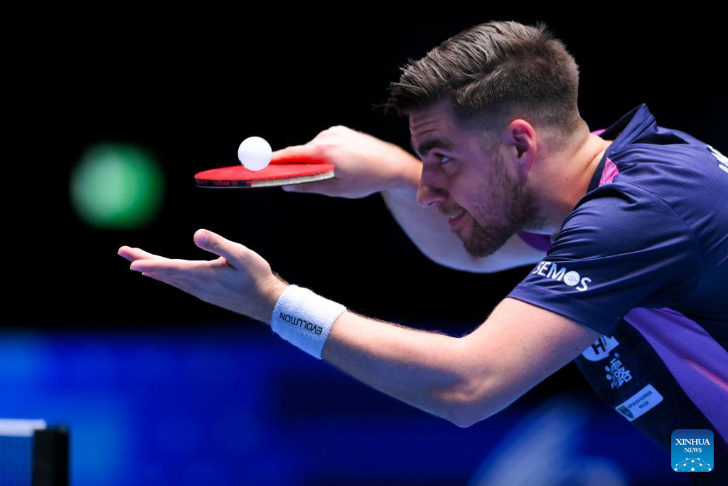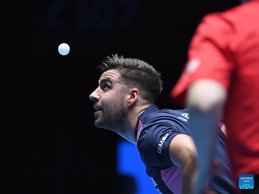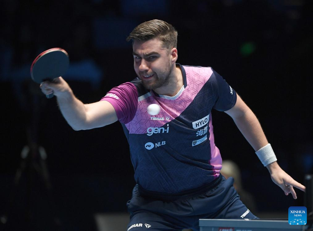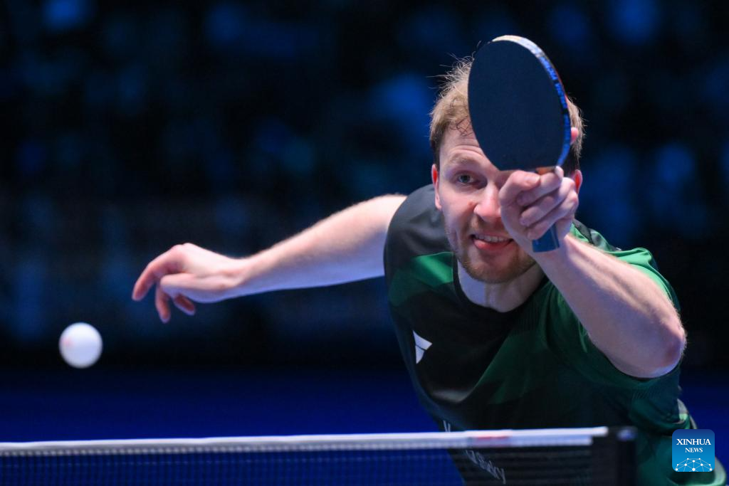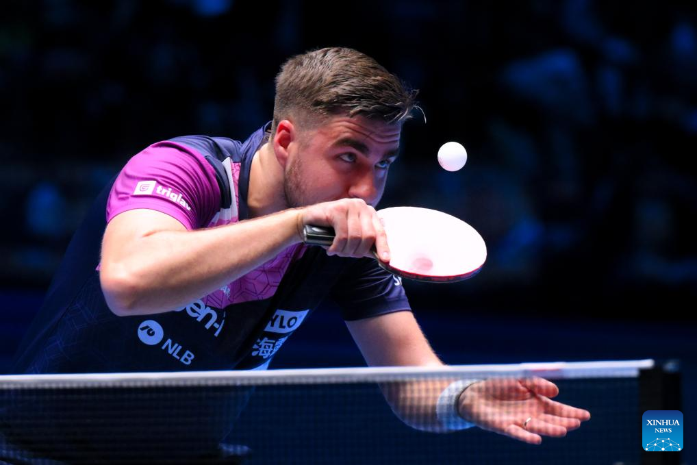Benedikt Duda of Germany hits a return during the men's singles quarterfinal match between Wang Chuqin of China and Benedikt Duda of Germany at the ITTF Men's and Women's World Cup 2025 in Macao, China, April 18, 2025. (Xinhua/Cheong Kam Ka)