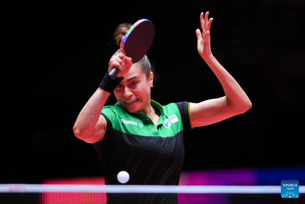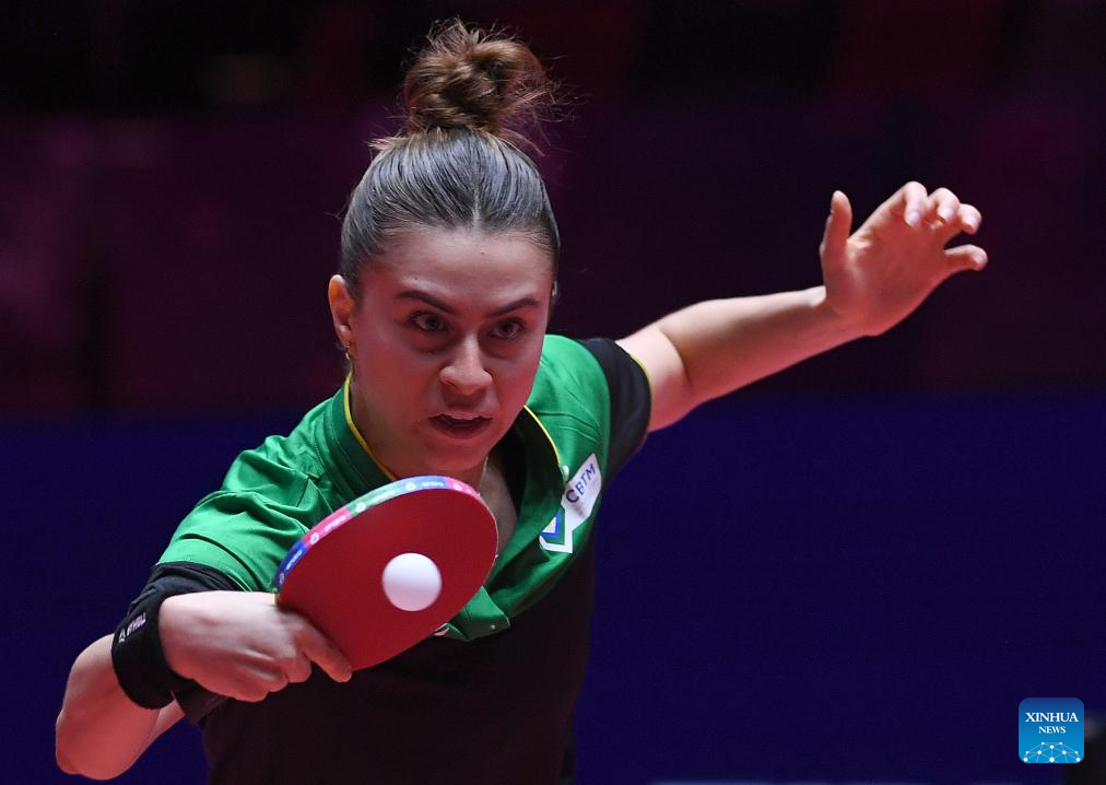 Bruna Takahashi of Brazil hits a return during the women's singles quarterfinal match between Chen Xingtong of China and Bruna Takahashi of Brazil at the ITTF Men's and Women's World Cup 2025 in Macao, China, April 18, 2025. (Xinhua/Chen Duo)