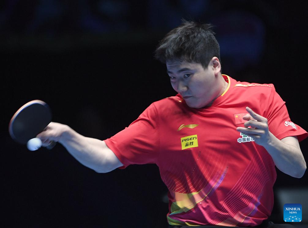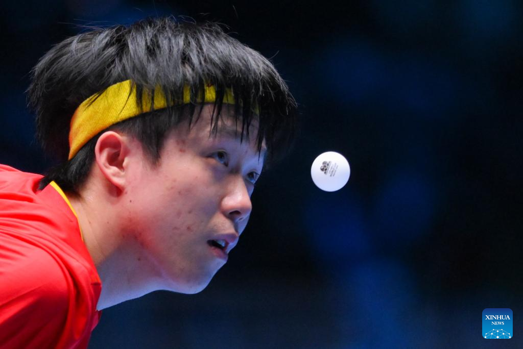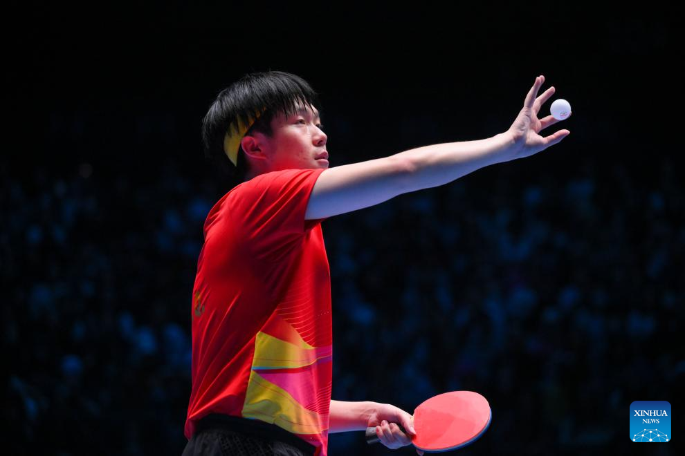 Liang Jingkun of China hits a return during the men's singles quarterfinal match between Liang Jingkun of China and Darko Jorgic of Slovenia at the ITTF Men's and Women's World Cup 2025 in Macao, China, April 18, 2025. (Xinhua/Chen Duo)