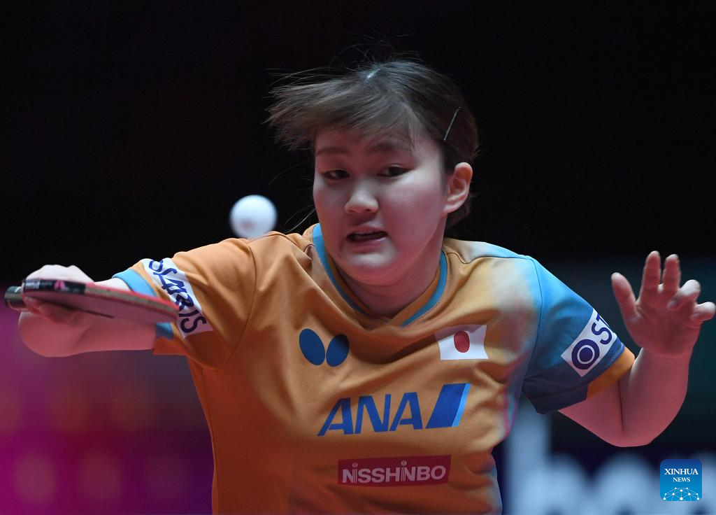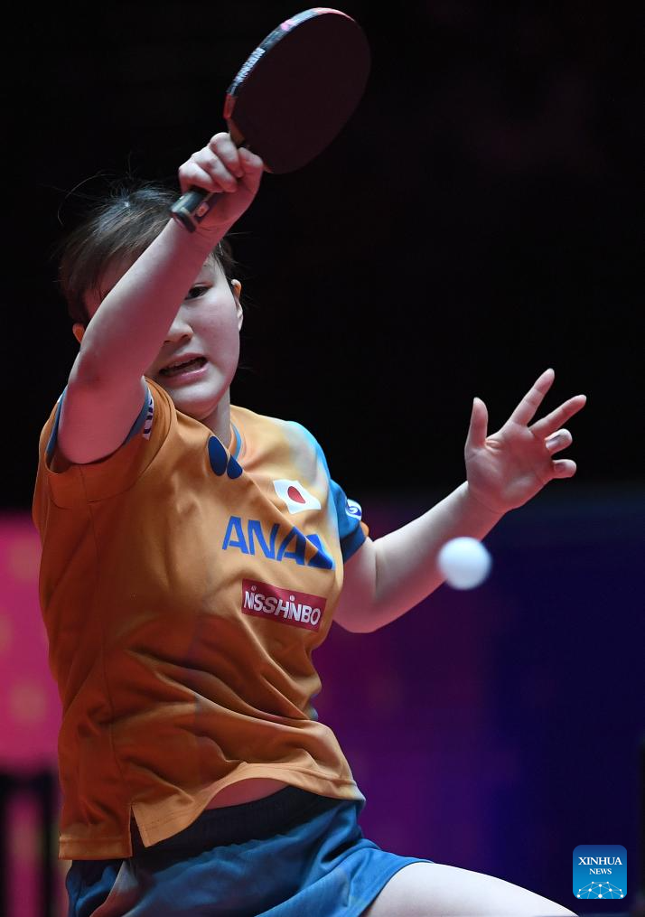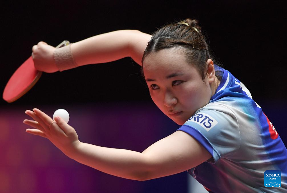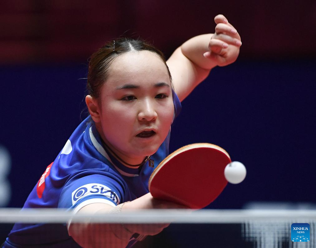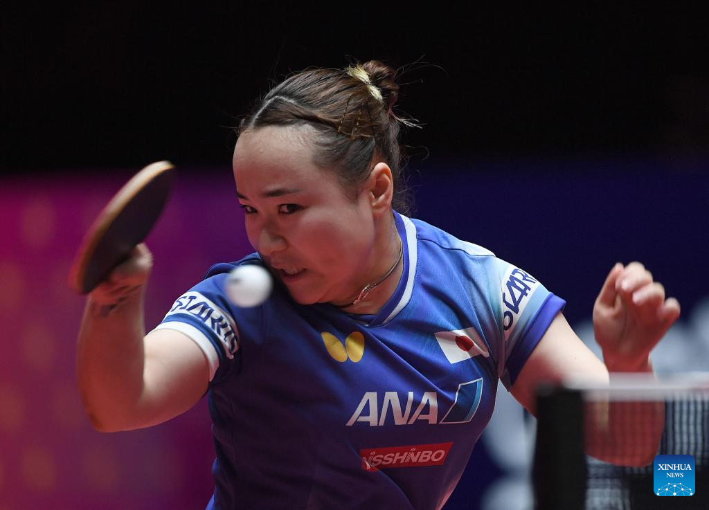 Odo Satsuki hits a return during the women's singles quarterfinal match between Ito Mima of Japan and Odo Satsuki of Japan at the ITTF Men's and Women's World Cup 2025 in Macao, China, April 18, 2025. (Xinhua/Chen Duo)