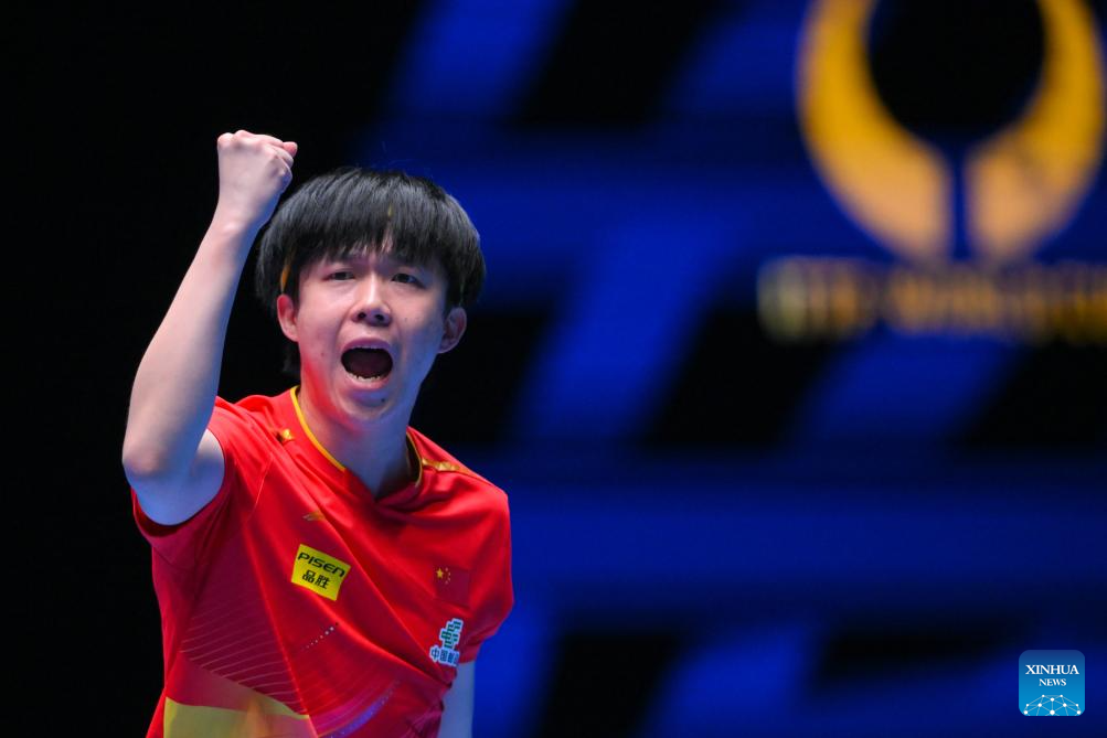 Wang Chuqin of China celebrates a point during the men's singles quarterfinal match between Wang Chuqin of China and Benedikt Duda of Germany at the ITTF Men's and Women's World Cup 2025 in Macao, China, April 18, 2025. (Xinhua/Cheong Kam Ka)