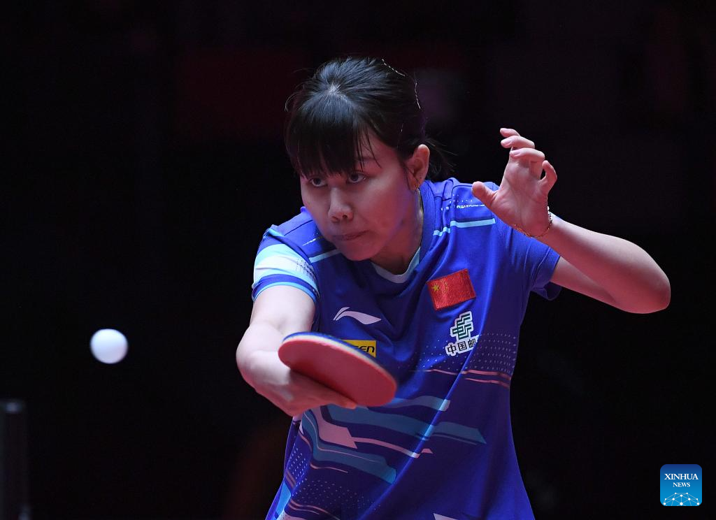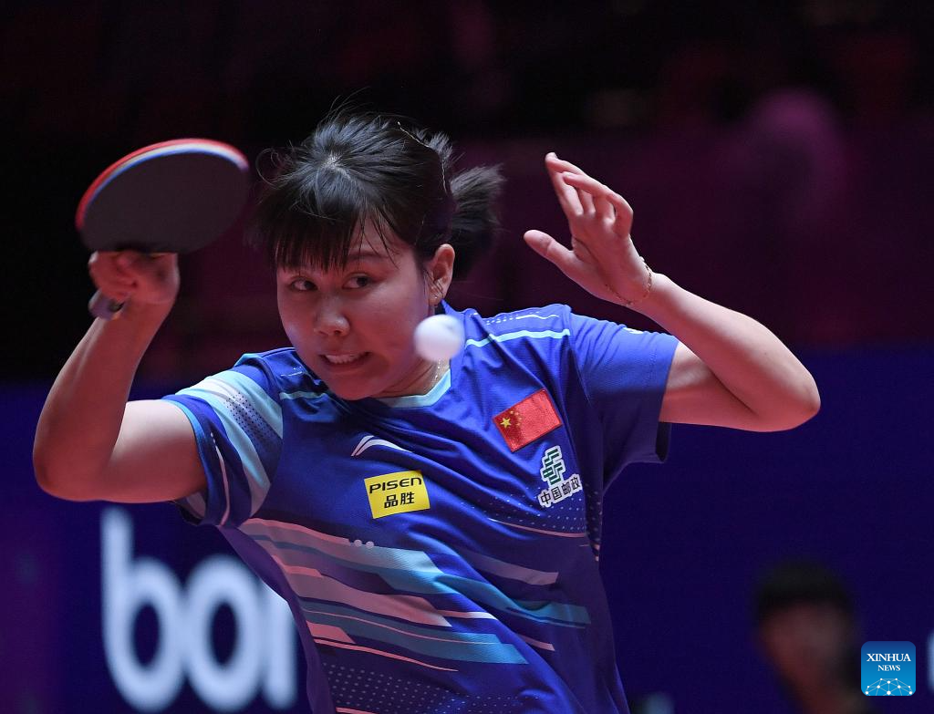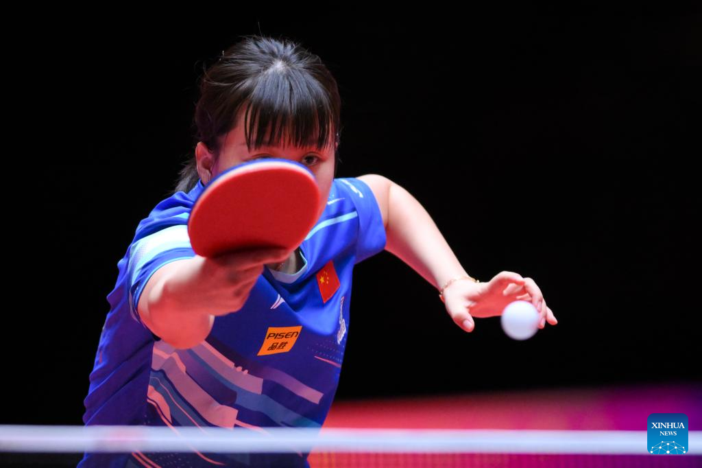 Wang Manyu hits a return during the women's singles quarterfinal match between Kuai Man of China and Wang Manyu of China at the ITTF Men's and Women's World Cup 2025 in Macao, China, April 18, 2025. (Xinhua/Cheong Kam Ka)