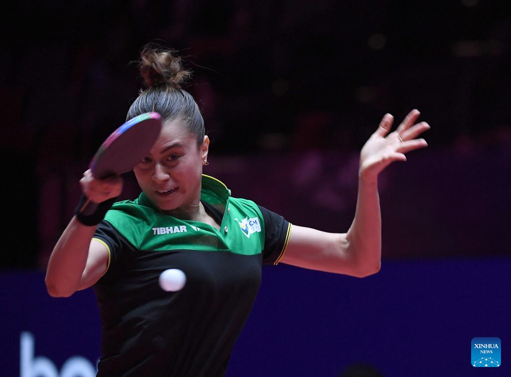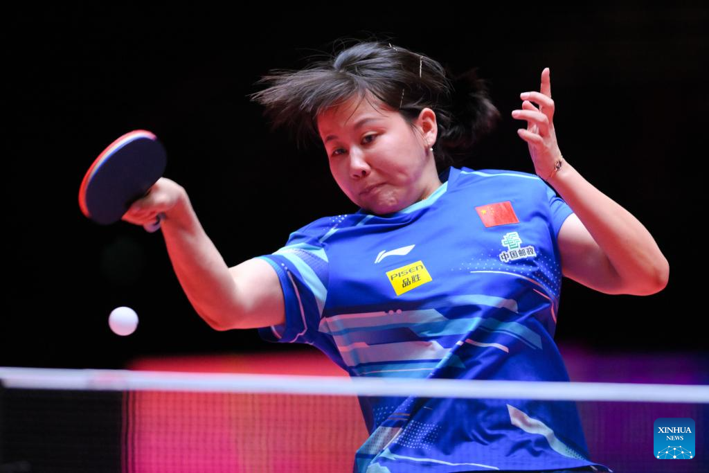 Cheng I-Ching hits a return during the women's singles quarterfinal match between Sun Yingsha of China and Cheng I-Ching of Chinese Taipei at the ITTF Men's and Women's World Cup 2025 in Macao, China, April 18, 2025. (Xinhua/Chen Duo)
