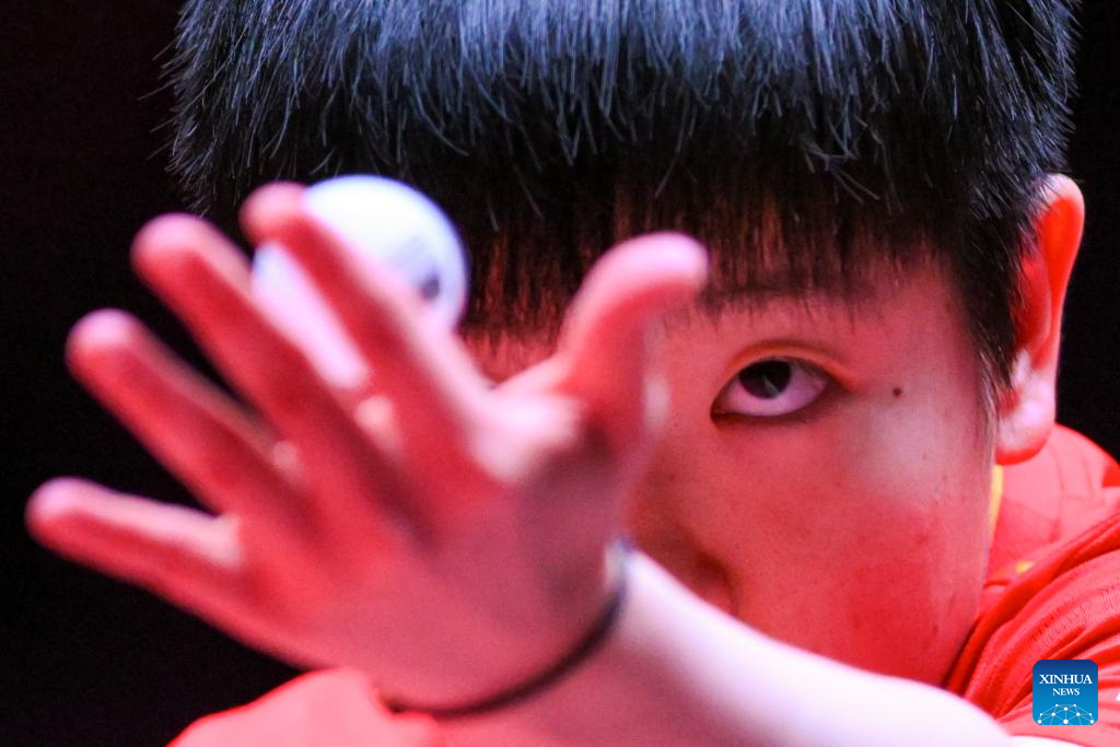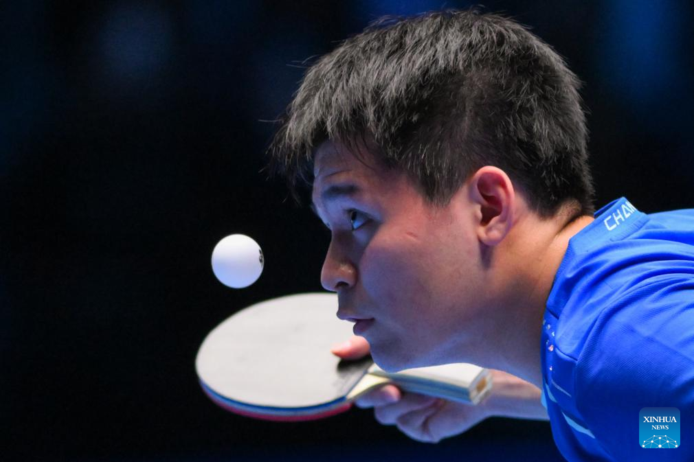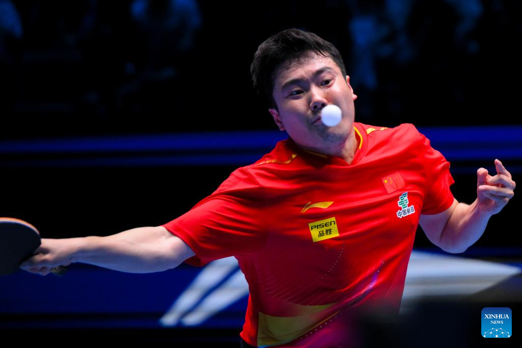 Liang Jingkun of China hits a return during the men's singles quarterfinal match between Liang Jingkun of China and Darko Jorgic of Slovenia at the ITTF Men's and Women's World Cup 2025 in Macao, China, April 18, 2025. (Xinhua/Cheong Kam Ka)