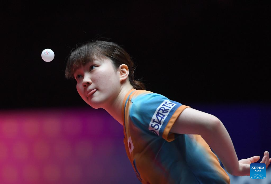 Ito Mima serves during the women's singles quarterfinal match between Ito Mima of Japan and Odo Satsuki of Japan at the ITTF Men's and Women's World Cup 2025 in Macao, China, April 18, 2025. (Xinhua/Chen Duo)