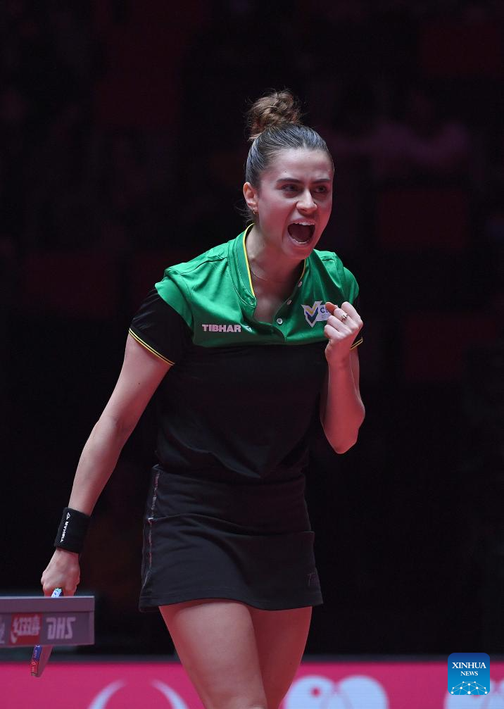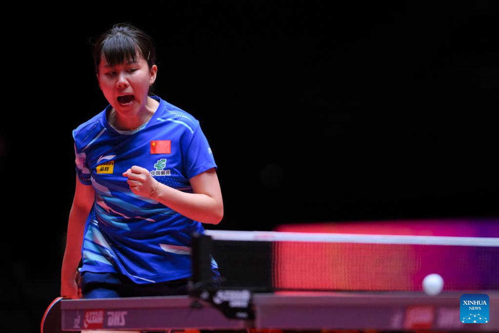 Wang Manyu celebrates scoring during the women's singles quarterfinal match between Kuai Man of China and Wang Manyu of China at the ITTF Men's and Women's World Cup 2025 in Macao, China, April 18, 2025. (Xinhua/Cheong Kam Ka)