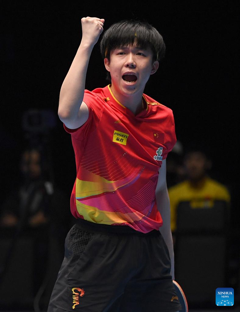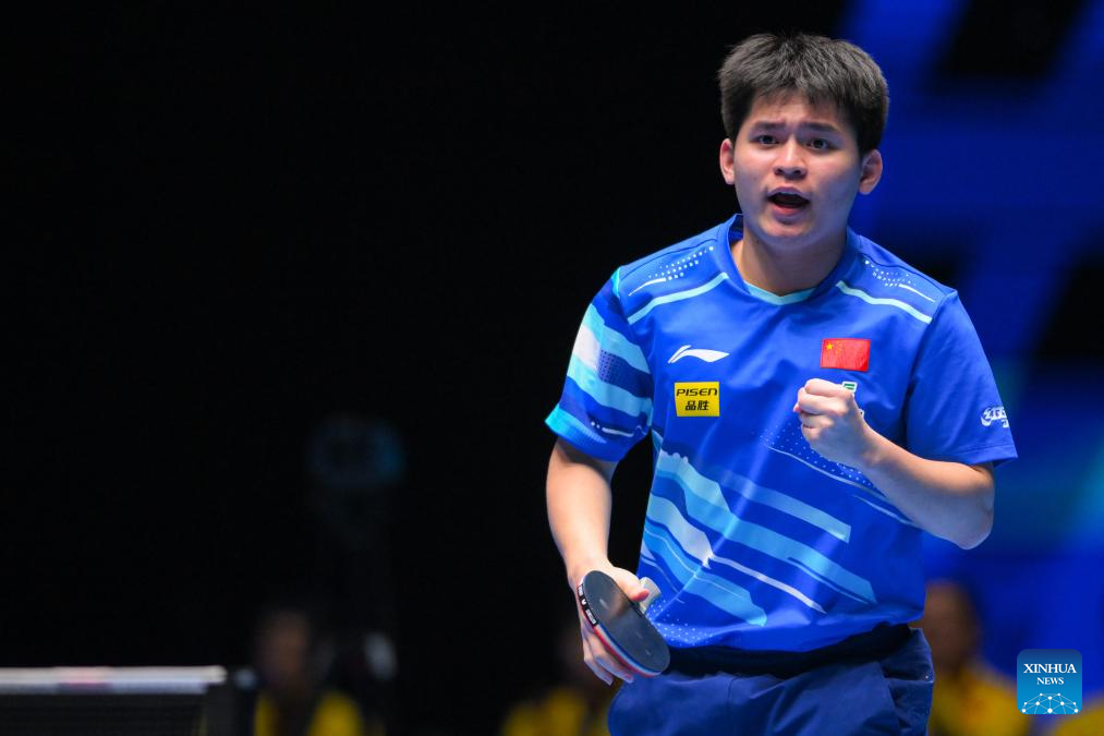 Lin Shidong celebrates scoring during the men's singles quarterfinal match between Lin Shidong of China and Truls Moregard of Sweden at the ITTF Men's and Women's World Cup 2025 in Macao, China, April 18, 2025. (Xinhua/Cheong Kam Ka)