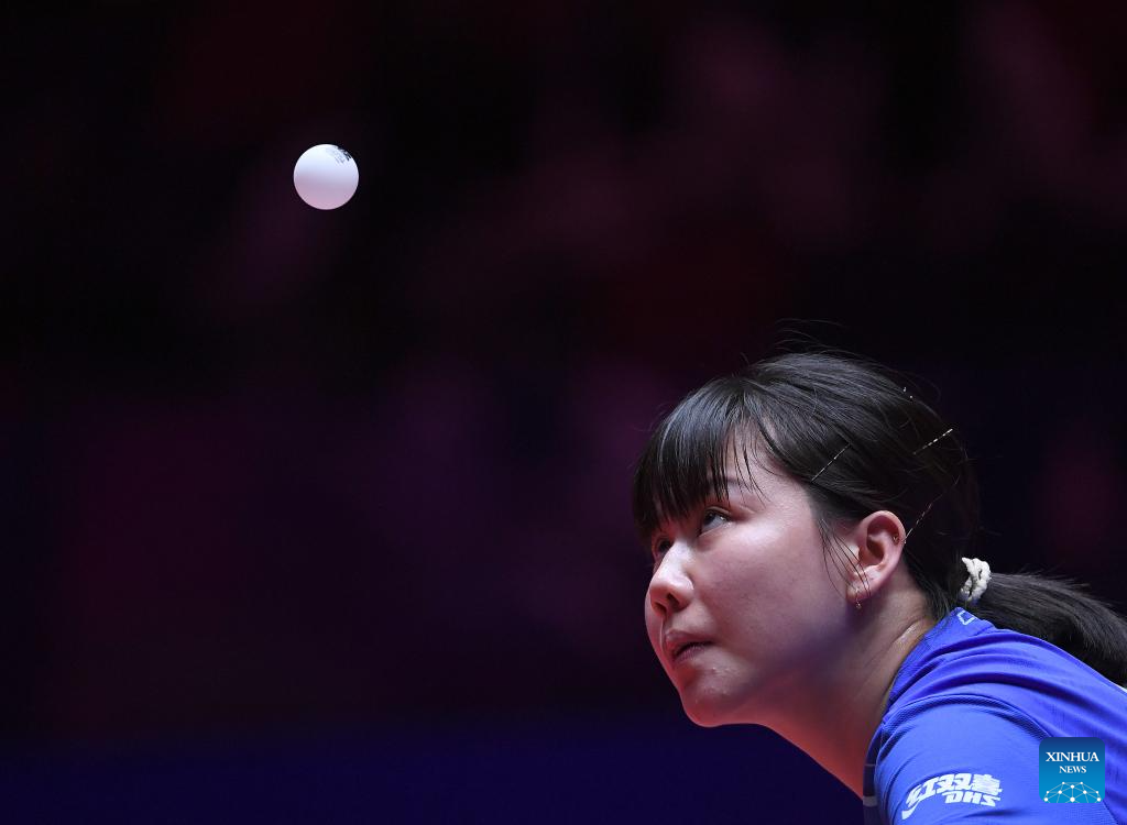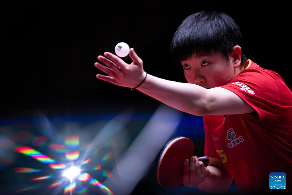Sun Yingsha serves during the women's singles quarterfinal match between Sun Yingsha of China and Cheng I-Ching of Chinese Taipei at the ITTF Men's and Women's World Cup 2025 in Macao, China, April 18, 2025. (Xinhua/Cheong Kam Ka)