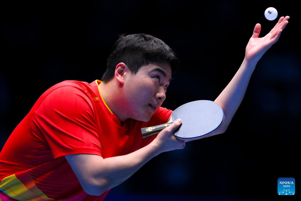 Wang Chuqin of China serves during the men's singles quarterfinal match between Wang Chuqin of China and Benedikt Duda of Germany at the ITTF Men's and Women's World Cup 2025 in Macao, China, April 18, 2025. (Xinhua/Cheong Kam Ka)
