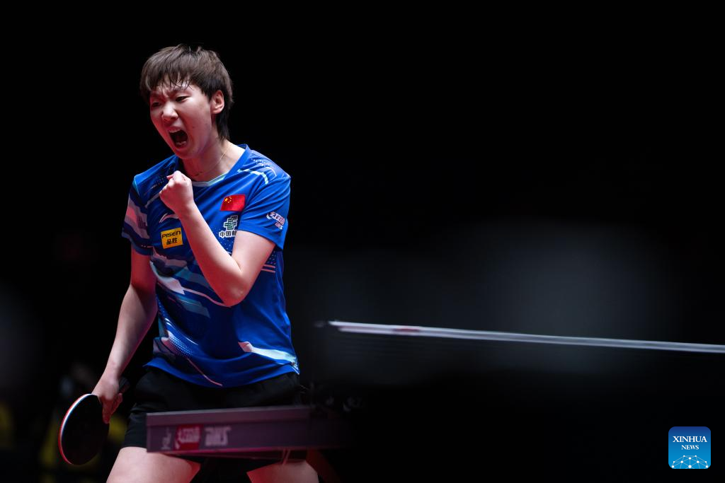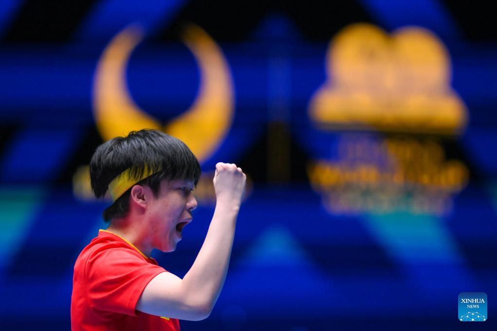 Chen Xingtong of China celebrates a point during the women's singles quarterfinal match between Chen Xingtong of China and Bruna Takahashi of Brazil at the ITTF Men's and Women's World Cup 2025 in Macao, China, April 18, 2025. (Xinhua/Cheong Kam Ka)