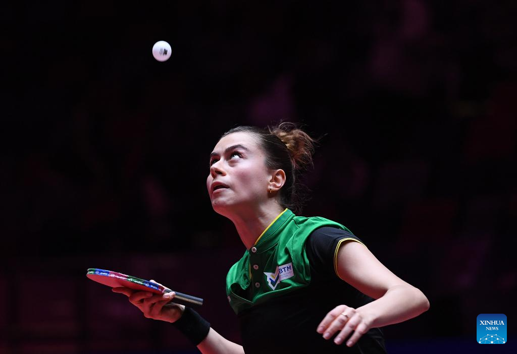Bruna Takahashi of Brazil serves during the women's singles quarterfinal match between Chen Xingtong of China and Bruna Takahashi of Brazil at the ITTF Men's and Women's World Cup 2025 in Macao, China, April 18, 2025. (Xinhua/Chen Duo)