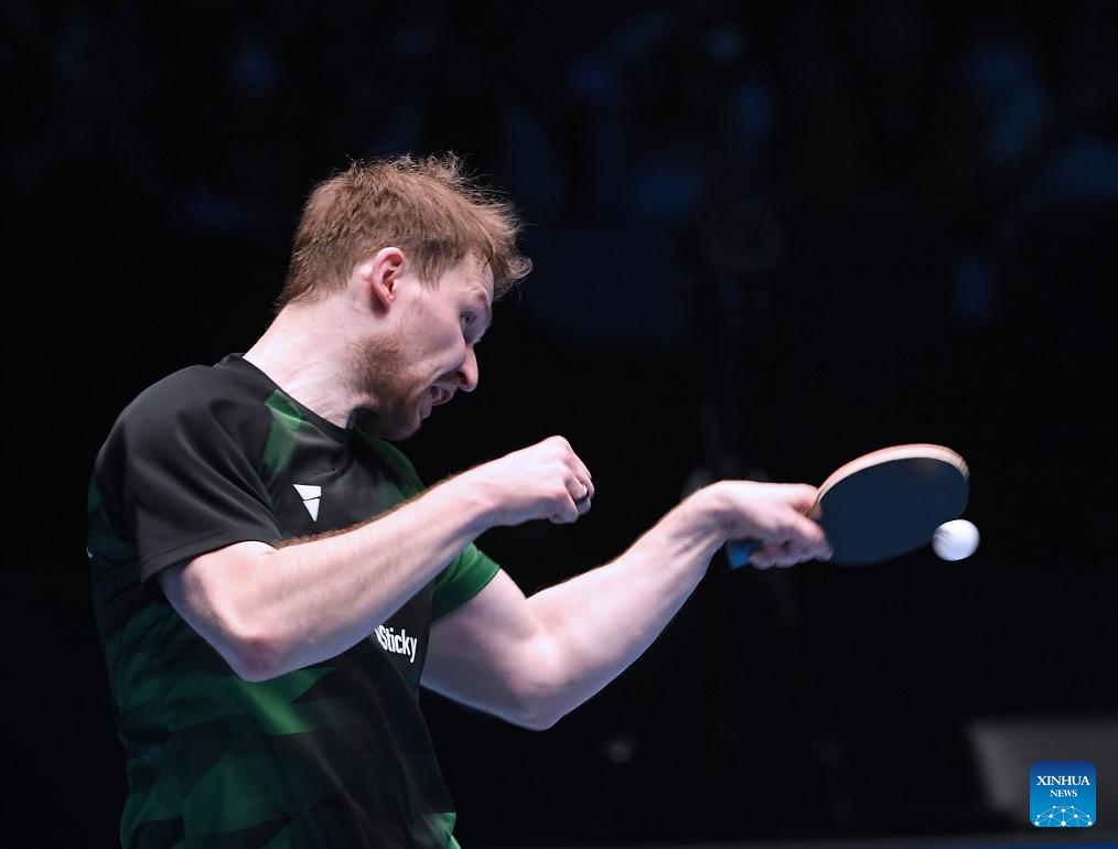 Benedikt Duda of Germany hits a return during the men's singles quarterfinal match between Wang Chuqin of China and Benedikt Duda of Germany at the ITTF Men's and Women's World Cup 2025 in Macao, China, April 18, 2025. (Xinhua/Chen Duo)