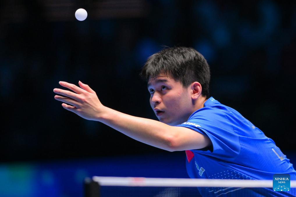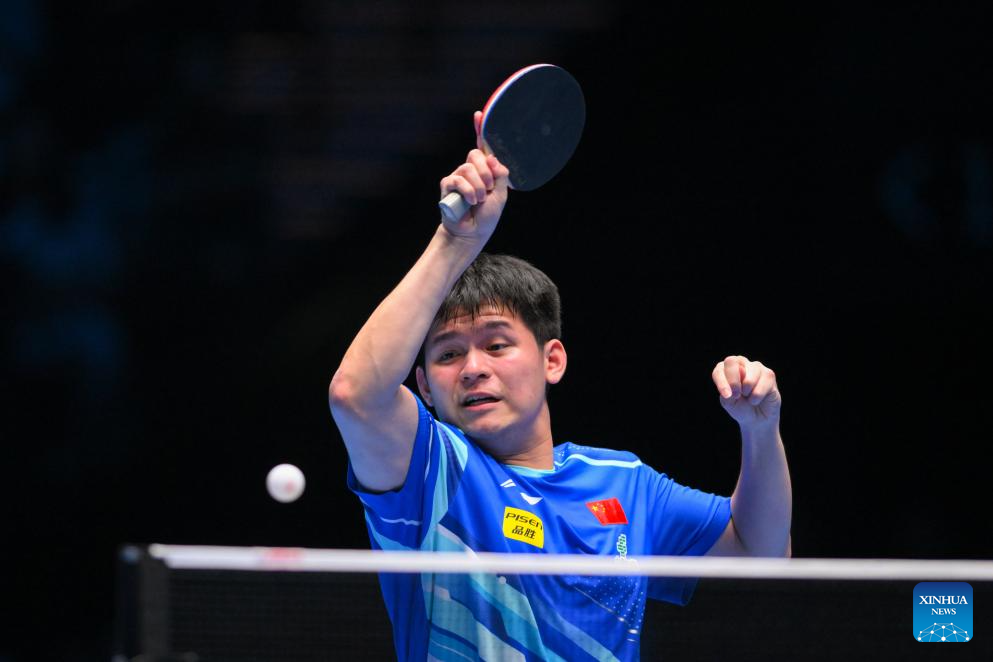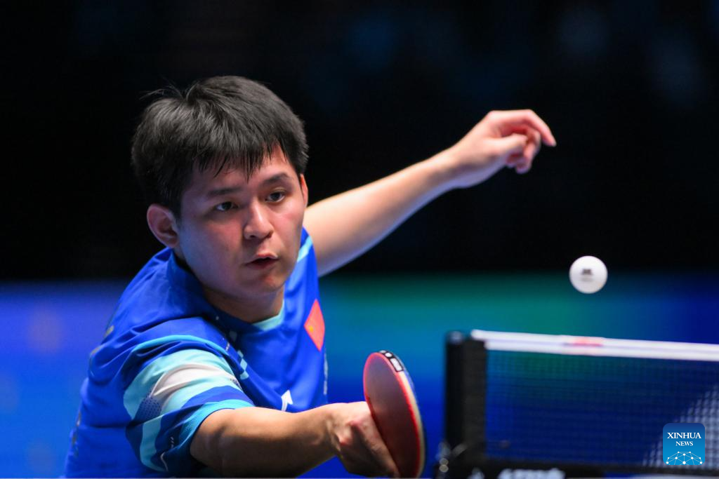 Lin Shidong hits a return during the men's singles quarterfinal match between Lin Shidong of China and Truls Moregard of Sweden at the ITTF Men's and Women's World Cup 2025 in Macao, China, April 18, 2025. (Xinhua/Cheong Kam Ka)