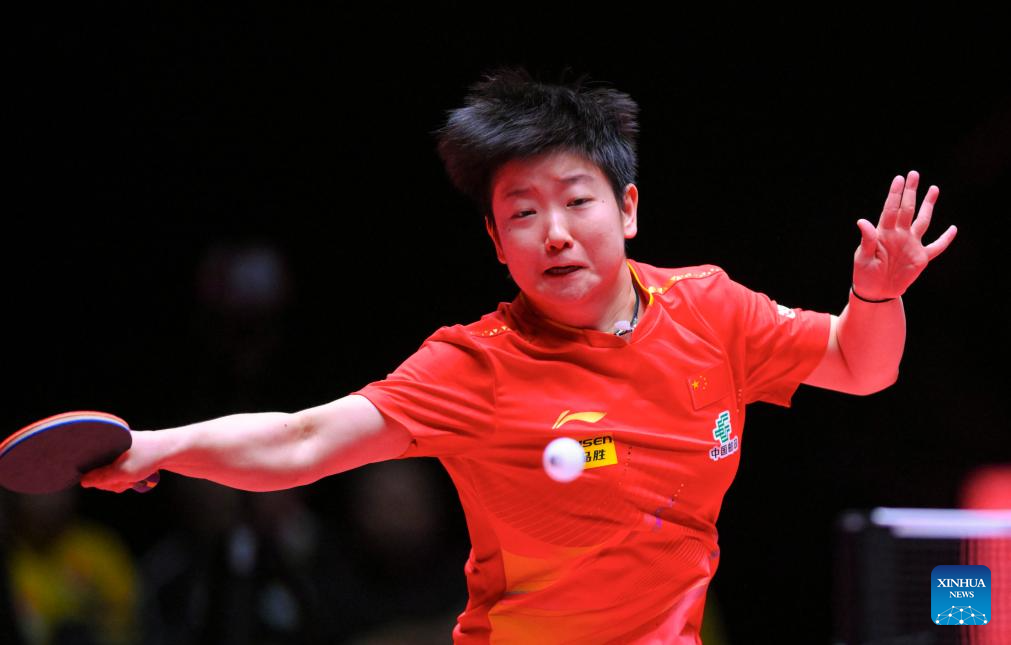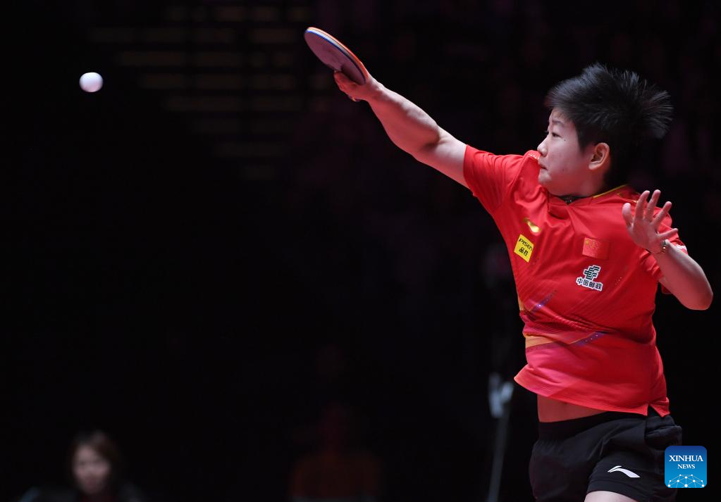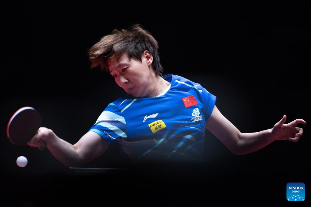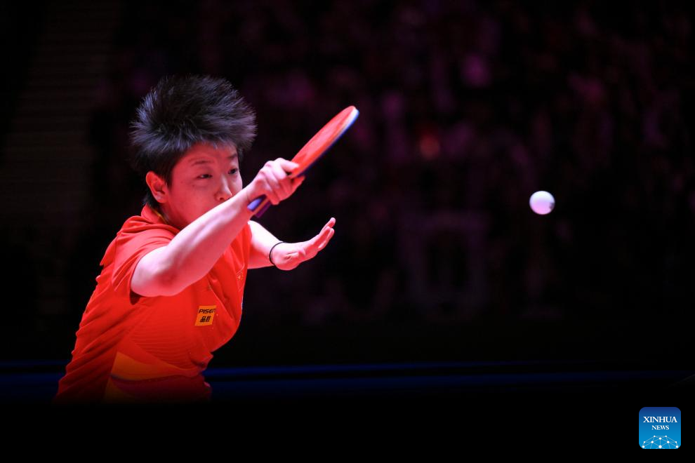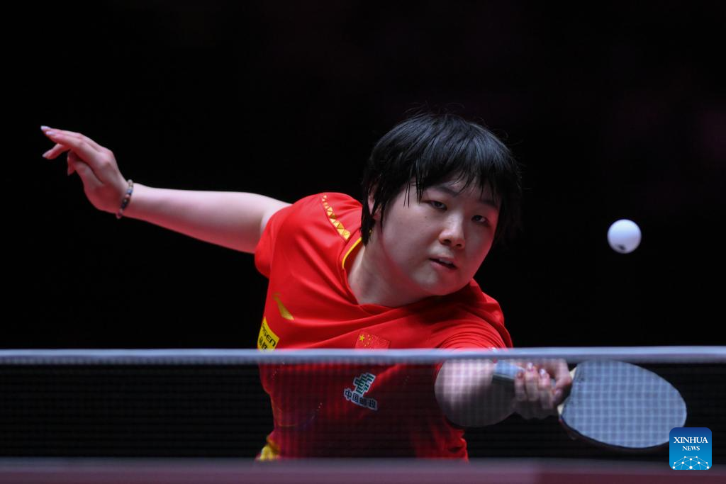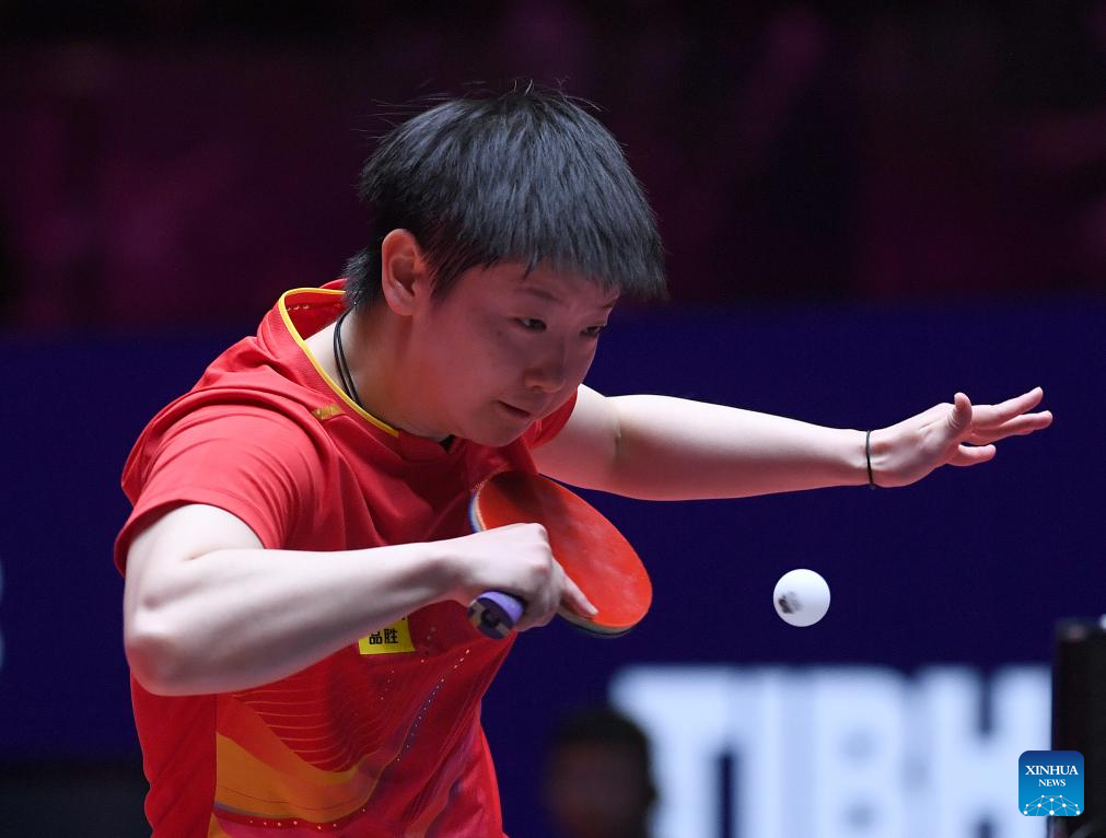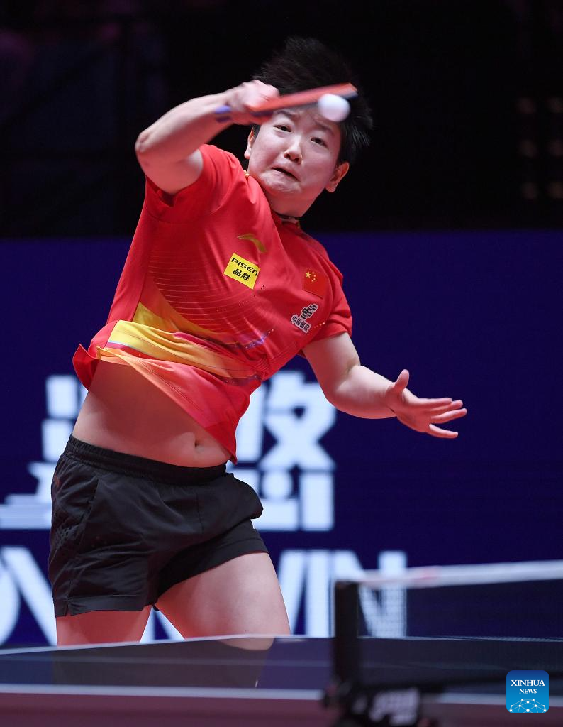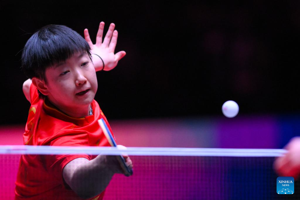 Sun Yingsha hits a return during the women's singles quarterfinal match between Sun Yingsha of China and Cheng I-Ching of Chinese Taipei at the ITTF Men's and Women's World Cup 2025 in Macao, China, April 18, 2025. (Xinhua/Cheong Kam Ka)