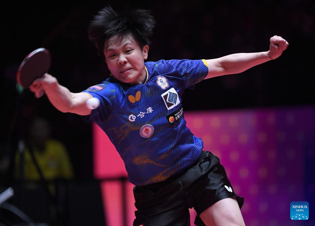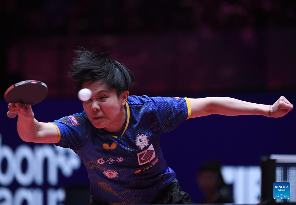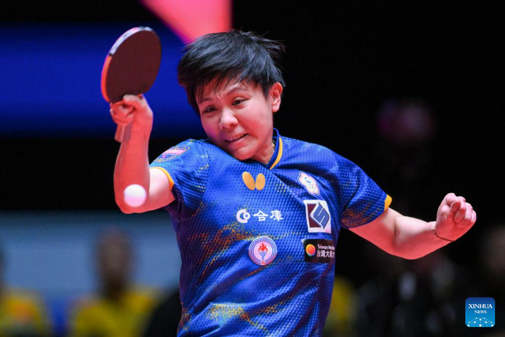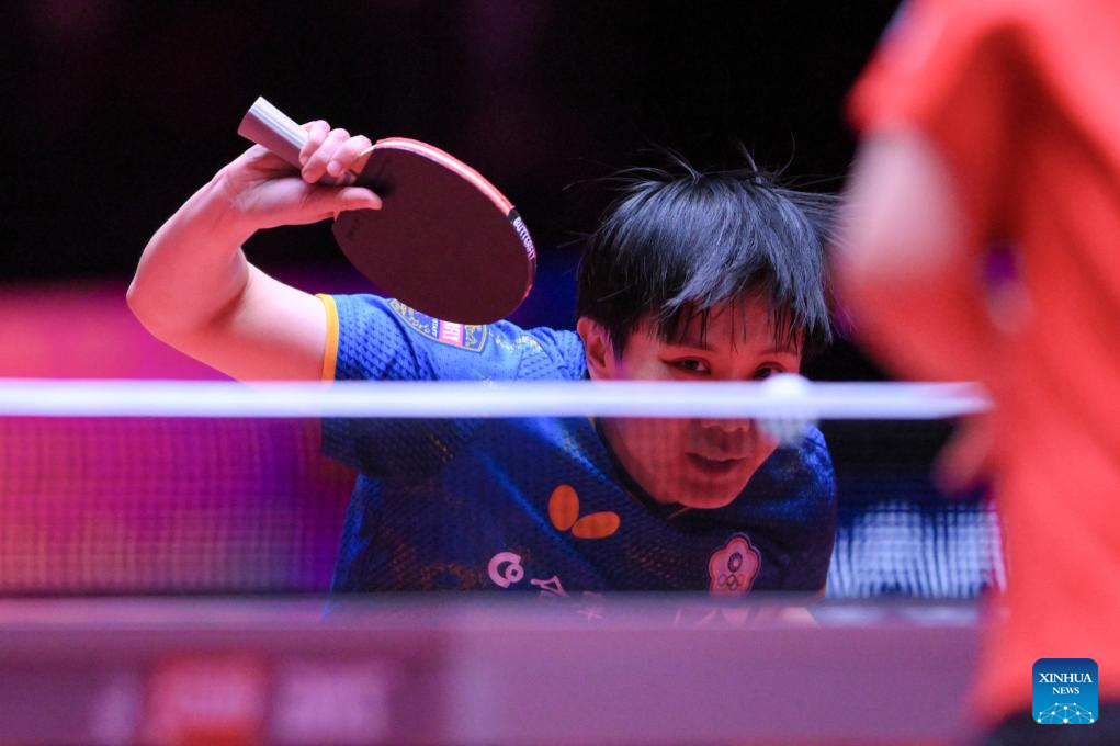 Cheng I-Ching hits a return during the women's singles quarterfinal match between Sun Yingsha of China and Cheng I-Ching of Chinese Taipei at the ITTF Men's and Women's World Cup 2025 in Macao, China, April 18, 2025. (Xinhua/Cheong Kam Ka)