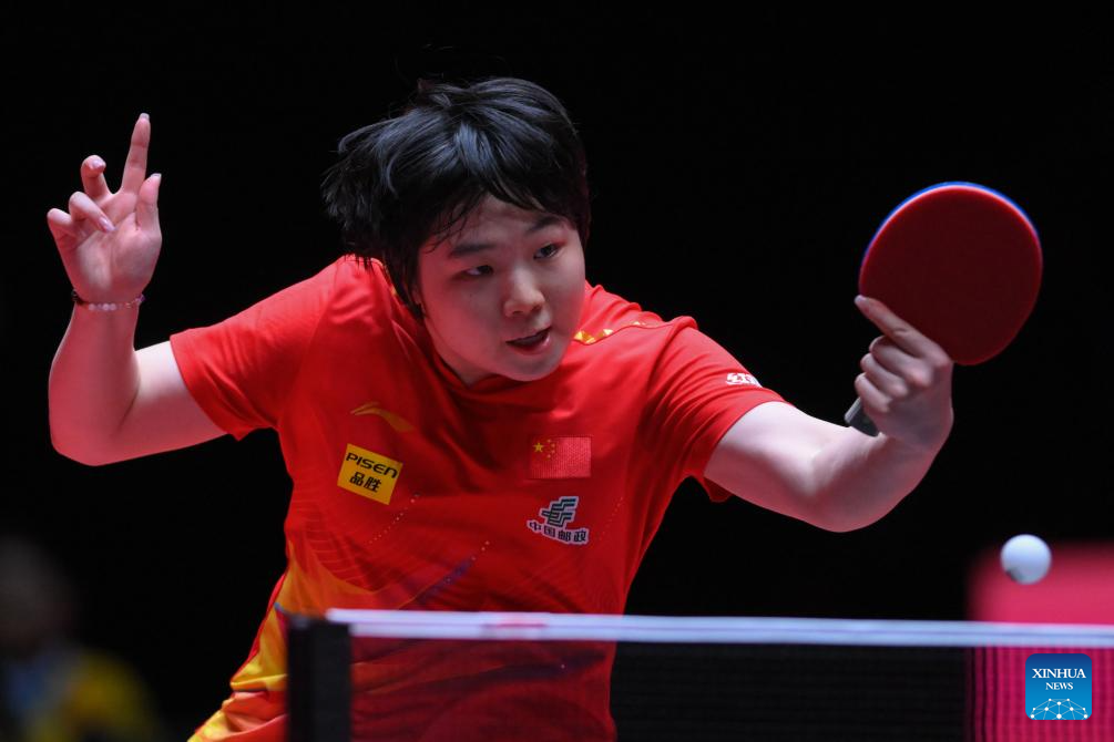Kuai Man hits a return during the women's singles quarterfinal match between Kuai Man of China and Wang Manyu of China at the ITTF Men's and Women's World Cup 2025 in Macao, China, April 18, 2025. (Xinhua/Cheong Kam Ka)