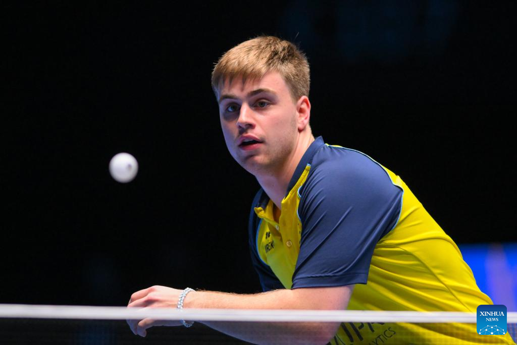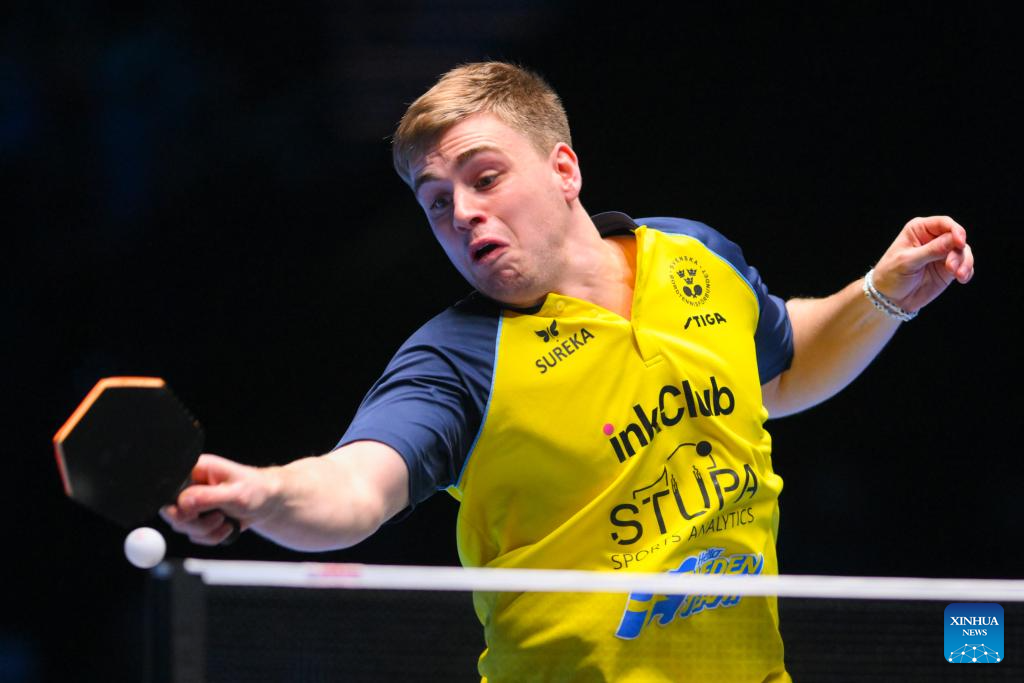 Truls Moregard hits a return during the men's singles quarterfinal match between Lin Shidong of China and Truls Moregard of Sweden at the ITTF Men's and Women's World Cup 2025 in Macao, China, April 18, 2025. (Xinhua/Cheong Kam Ka)