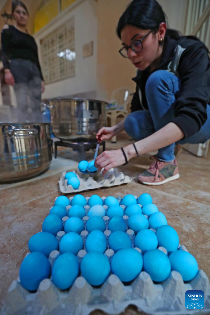 A woman colors eggs in preparation for Easter in Beirut, Lebanon, April 18, 2025. (Xinhua/Bilal Jawich)