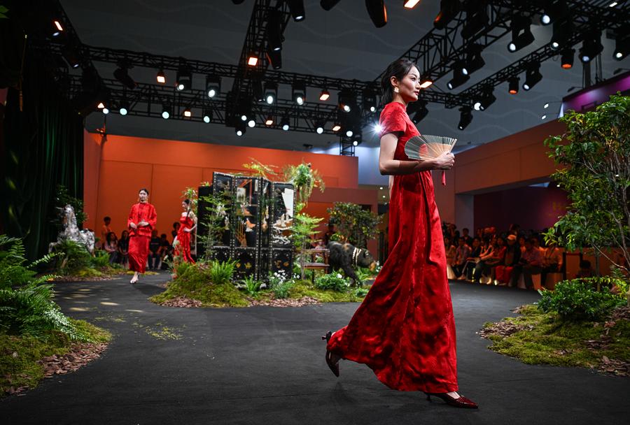 Models present fashion designs of Vietnamese brand "MEL ESSENTIALS" during the 5th China International Consumer Products Expo (CICPE) in Haikou, south China's Hainan Province, April 15, 2025. (Xinhua/Pu Xiaoxu)