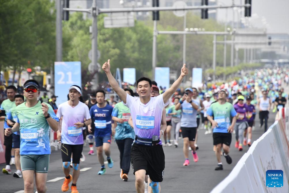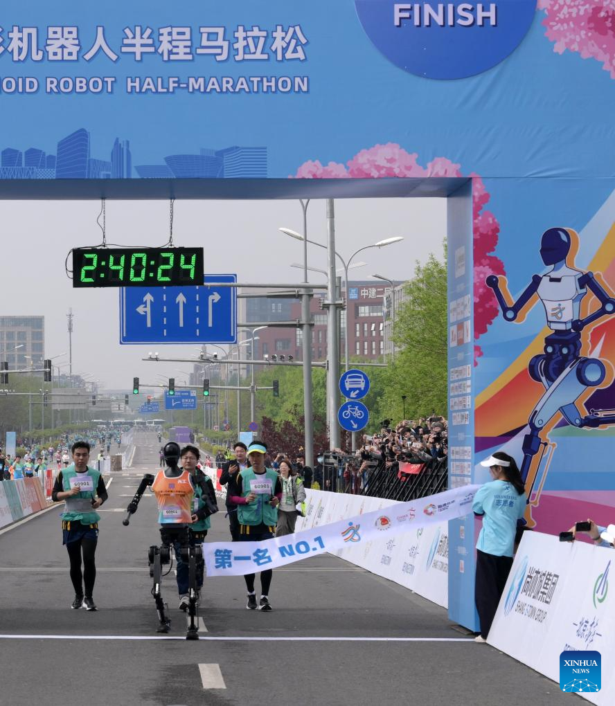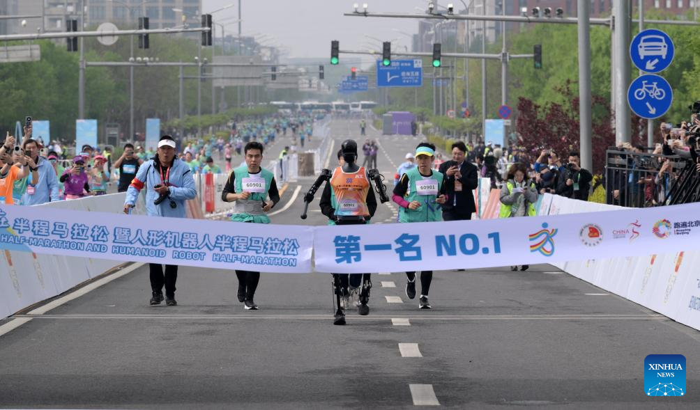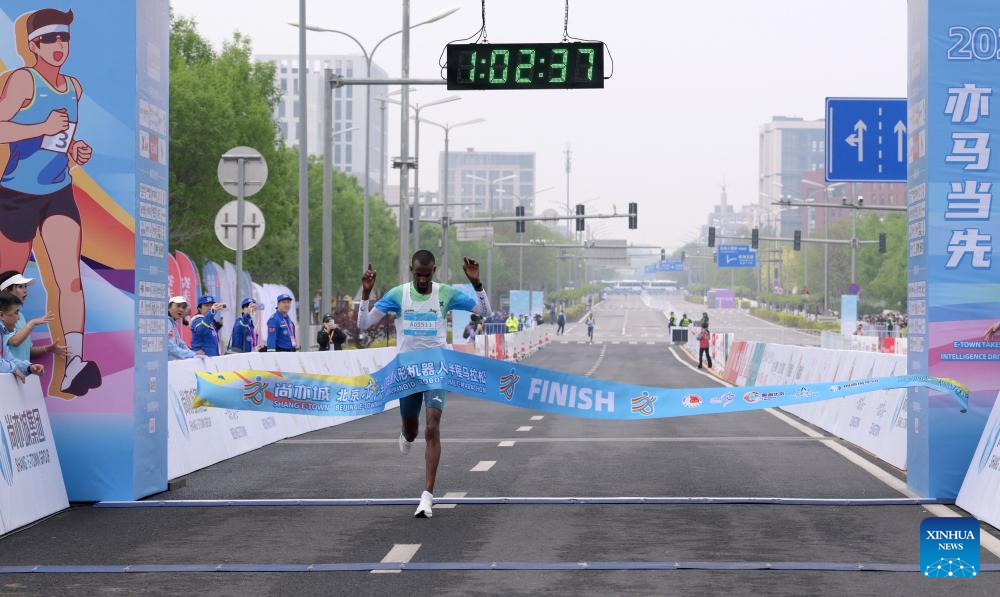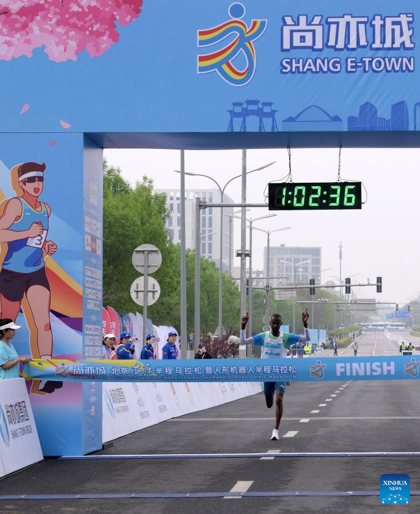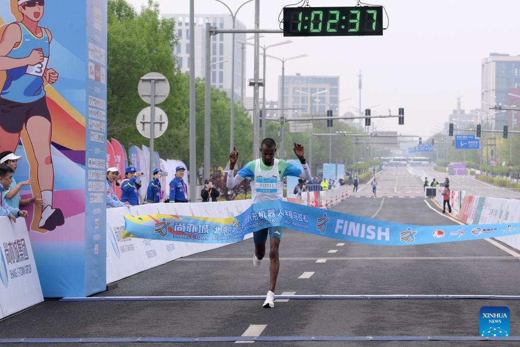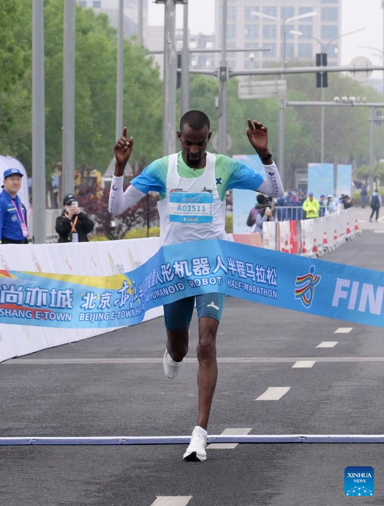Elias Desta of Ethiopia crosses the finishing line during the Beijing E-Town half-marathon and humanoid robots half-marathon in the Beijing Economic-Technological Development Area in southeast Beijing, April 19, 2025. (Xinhua/Li He)