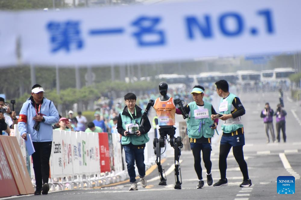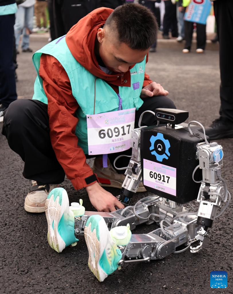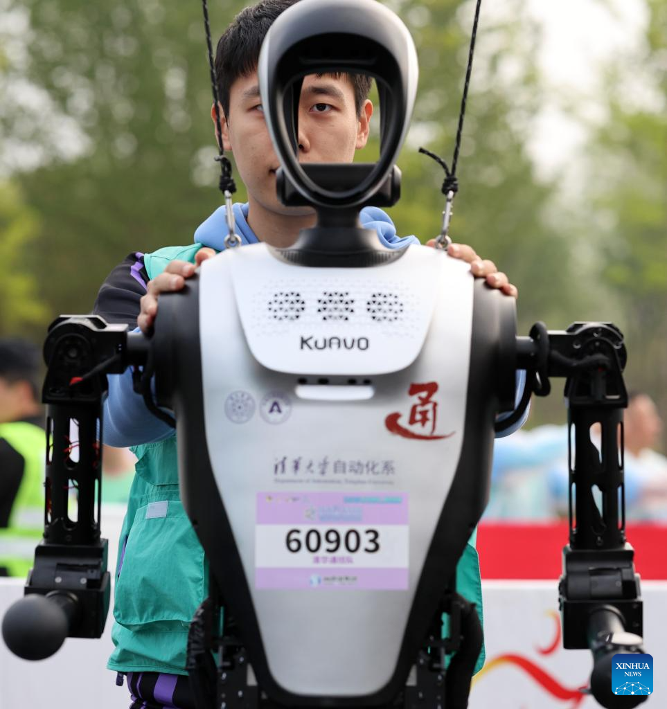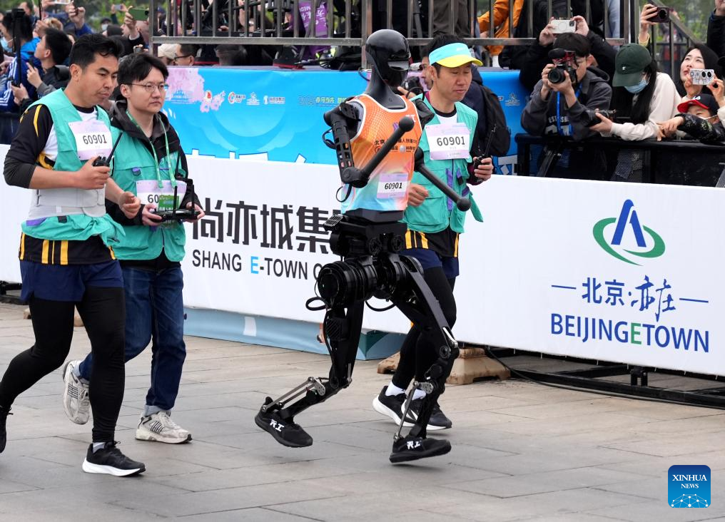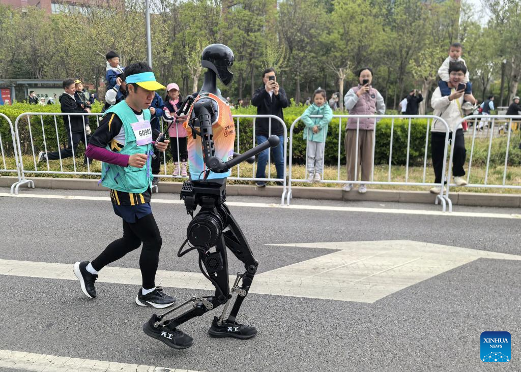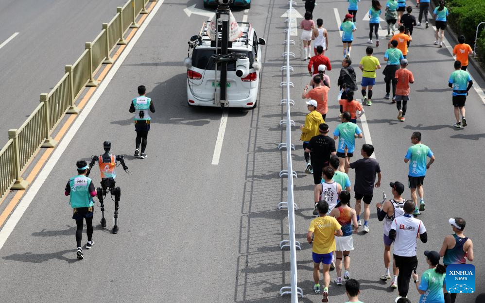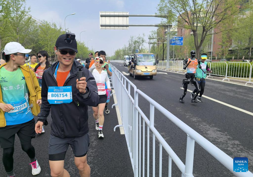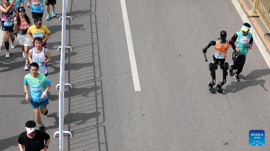 Robotic and human participants compete during the Beijing E-Town half-marathon and humanoid robots half-marathon in the Beijing Economic-Technological Development Area in southeast Beijing, China, April 19, 2025. (Xinhua/Cao Can)