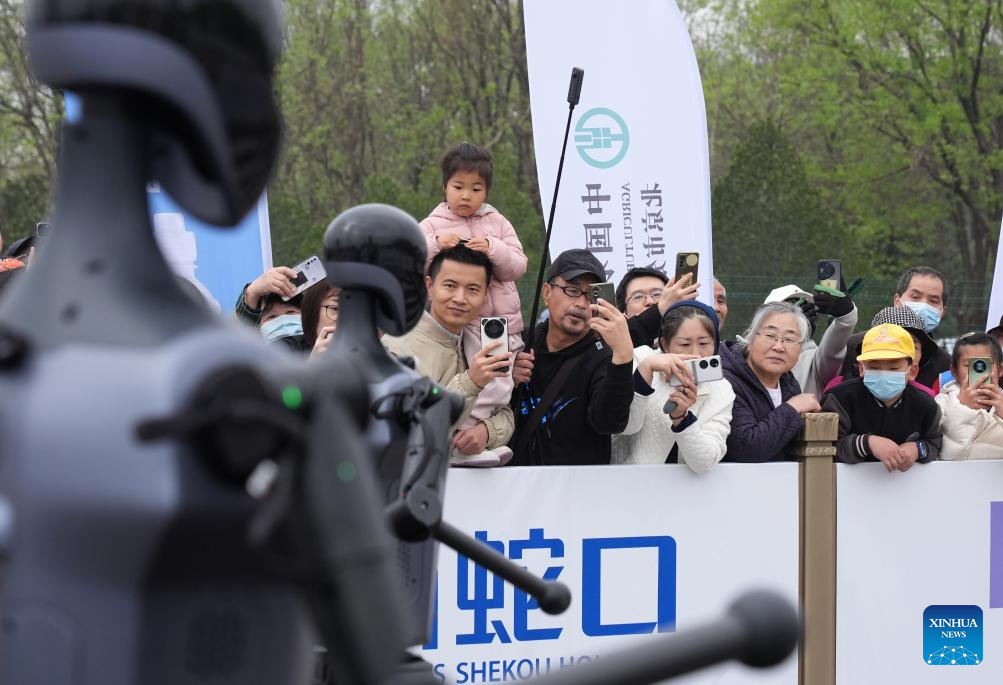 People watches the Beijing E-Town half-marathon and humanoid robots half-marathon in the Beijing Economic-Technological Development Area in southeast Beijing, China, April 19, 2025. (Xinhua/Zhang Chenlin)
