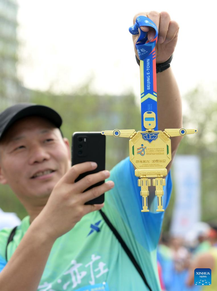 A participant take photos of the finisher medal after the Beijing E-Town half-marathon and humanoid robots half-marathon in the Beijing Economic-Technological Development Area in southeast Beijing, China, April 19, 2025. (Xinhua/Li He)